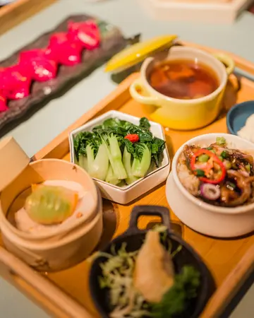 假日去完尖沙咀行街,就去咗明干小馆饮茶!而家仲有优惠,免茶位同有九折👍🏻👍🏻👍🏻中式茶都有好多款式可选择, 我就选择了高山云雾绿茶,清澈透明,口感醇厚!午市套餐 $88/位包老火炖汤+及新鲜蔬菜一碟荷香虫草花滑鸡饭鸡肉嫩滑, 配虫草花好夹👍🏻荷香陈皮豉汁蒸白鳝饭白鳝啖啖肉冇刺, 好鲜甜!点心八选二彩虹虾饺色彩缤纷,虾肉爽口弹牙!萝卜丝酥外皮好松脆,入面系爆馅萝卜丝👍🏻 另外加了些点心米网鸳鸯肠有粒粒虾肉, 米网非常脆卜卜,有口感👍🏻黑金流沙包外形吸引,上面有金箔,咸咸甜甜,非常美味 虾多士有原只大虾,多士松脆配千岛酱非常创新,够惹味😋雪茄春卷碟系好似烟灰盅,春卷外形仲有贴纸包装,真系好似雪茄!脆卜卜,外脆内软,有新鲜嘅虾肉手工莲藕饼份量好多,有五件,煎得好香口🥰甜品选择了芒果河粉,河粉非常烟韧,加上芒果系绝配…查看更多