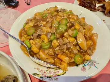 上面一层簿簿的花雕龙虾汤面,底下蛋白吃起清新而又清香的味道。旁边伴的蟹钳是加蒜蓉一起炸香的。吃时很有强烈对比
