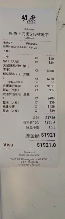 环境:我们去的是旺角店、应该是一家吃粤菜和海鲜的地方口味:濑尿虾个头很大,腌的挺好吃的、没有生的味道。盐焗花螺也很好吃,非常新鲜。炒饭也是粒粒分明,配料丰富,里面有很多海鲜。奄仔蟹会点火很惊艳,个头也很大只,蟹膏蟹肉比普通的蟹多些,吃起来很香。服务:要收服务费,所以服务真的挺好的,全程不用自己动手,态度也很好性价比:海鲜肯定会比小吃价格高一些、人均四五百的样子吧、整体味道还是很不错的、毕竟是明星餐厅
