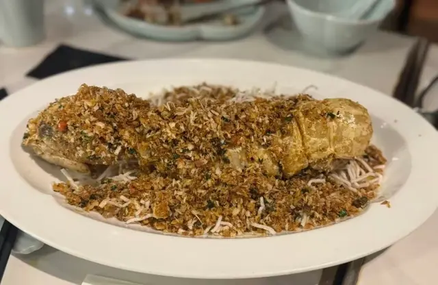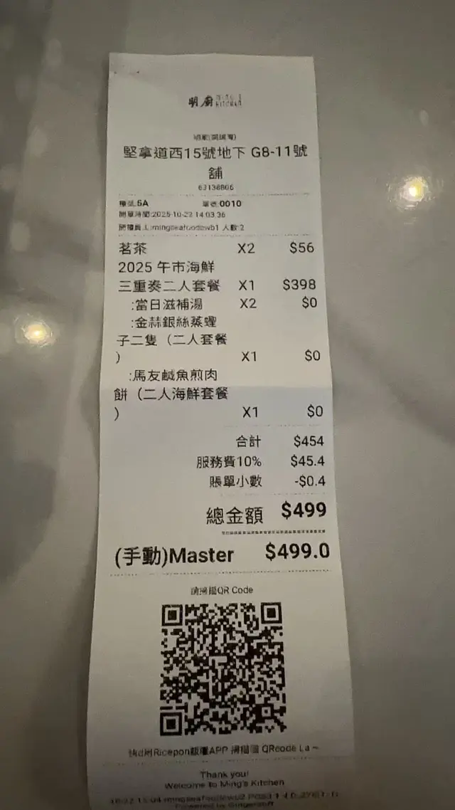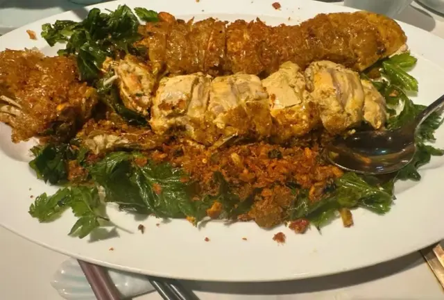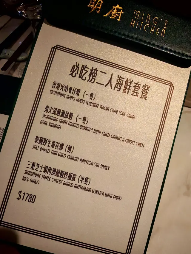 服务:非常好,工作人员会很贴心的介绍菜品、上菜会帮你拍照还有换碟子。菜品:香港火焰奄仔蟹超酷的,给小朋友炫开心啦,里面蟹黄很多。鬼火深喉手臂瀨尿蝦非常好看,也是和宣傳的一樣很大只,有手臂那么粗。涼捲花:姜味与料汁很浓郁,花甲很新鲜。三重芝士焗龙虾炒饭芝士很香,能拉丝,好吃,朋友最爱。性价比:还可以,看海鲜品质原材料也不是那种便宜货。环境:在永德大厦附近,店内装潢偏墨绿色,挺高级的。…查看更多