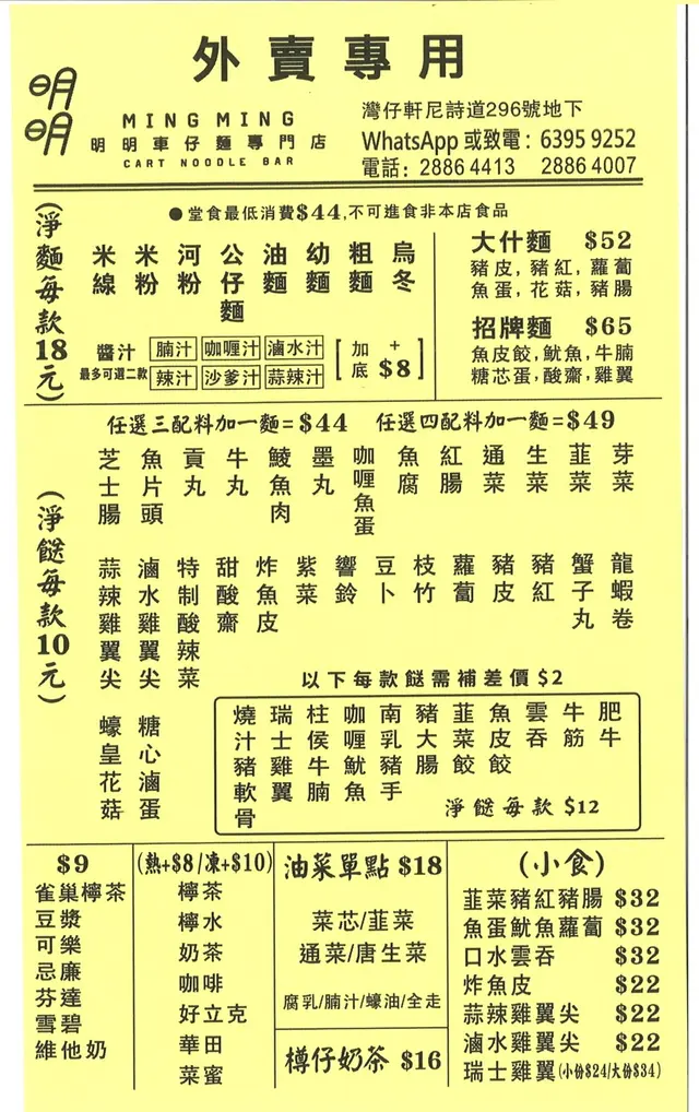 明明車仔麵專門店 (德華大廈) (湾仔) 网址: https://s.openrice.com/QrLS0EtiB00 地址: 香港灣仔軒尼詩道296號德華大廈地舖 电话: +852 28864413