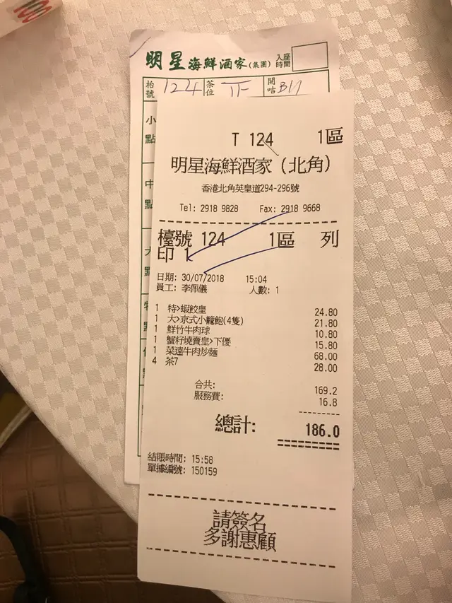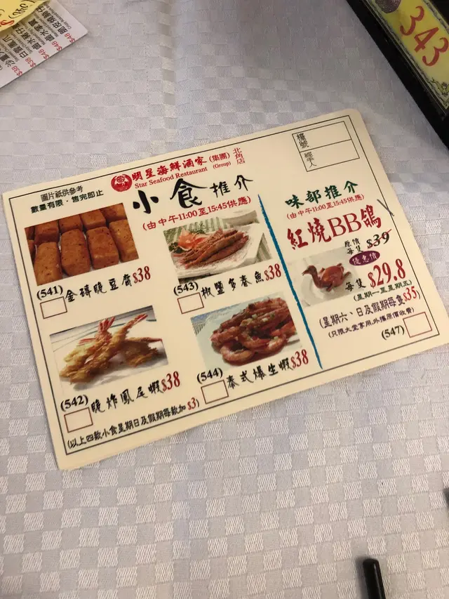 今日去了北角的=|| 明星海鮮酒家||= ,正午時分一行4人亦不需要等位。=|| 環境 ||= 步入大廳中,燈光昏暗,不像其他的酒樓般明亮。午市亦較多老年人光顧。值得一提的是廳面設置了很多電視機,如晚上有跑馬或是足球聯賽的日子,相信能滿足一眾人士。=|| 食物 ||= 午市優惠選擇眾多,令人心動的當然是9.8/一籠的《水晶鮮蝦餃》!我們也點了數款的小食,麻辣手撕雞、金磚脆豆腐/38、椒鹽多春魚/38、脆炸鳳尾蝦/38。可惜這間的水準不太好,麻辣手撕雞不麻也不辣,只有一股奇怪的油味;金磚脆豆腐沒有任何味道,配上旁邊的炸蒜也沒有任何的幫助;椒鹽多春魚及脆炸鳳尾蝦就是全頓飯中最好吃的東西,不但炸得蘇脆,也是充滿鮮味。但我肯定不會再回頭了。