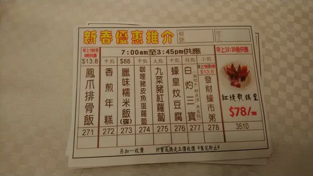 約左朋友天后交收,近近地揀左呢間食lunch,因為大集團關係,已經冇乜期望.一上去,知客比張飛我,行入去,無人理,唯有自己揾,點知揾唔到,見到有個樓面阿姐執緊枱,問佢我張枱喺邊,佢話唔知喎!然後繼續執枱,無理我地.見到另一個樓面,問佢張枱喺邊.佢話是旦坐坐低左畫好點心紙,舉左好耐手,無人理.有個阿姐行過,叫佢落單佢話等陣先.一直無人理,同一個阿姐第2次行過,佢又話等陣先我話又等?好艱難先落到單!蝦餃,肉絲炒麵味道ok,田園海鮮炒飯,冇味道,只有油味.唔夠食,再加單,點知D點心去錯晒隔離枱.已經冇耐性再食落去了,谷住滿肚子氣埋單!查看更多
