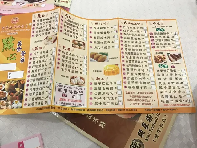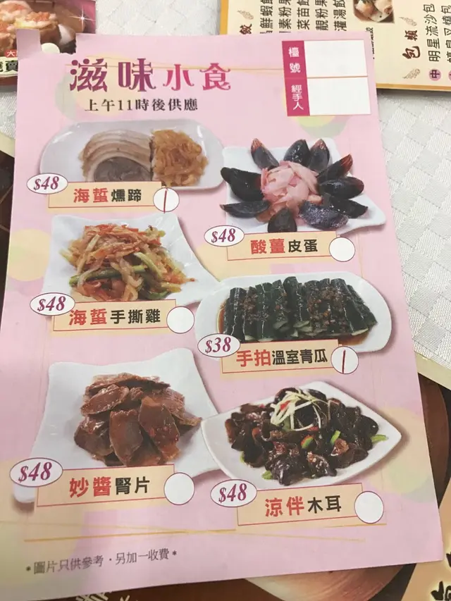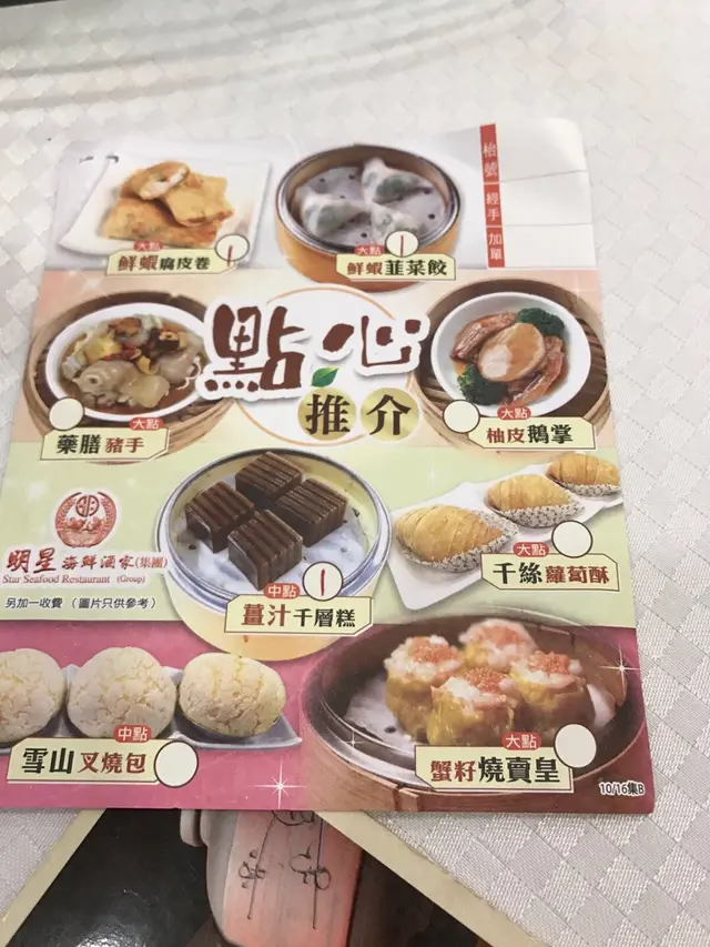 好耐無食點心,今日同同事忙裡偷閒,去咗明星嘆點心。酒樓座位闊落,坐得都幾舒適。我哋兩個人叫咗5個點心:皮蛋叉燒酥、妙醬蒸鳳爪(什麼是妙醬?)、鮮蝦蒸腸粉、金錢肚同山竹牛肉球。皮蛋叉燒酥:叉燒酥就食得多,皮蛋叉燒酥真係第一次。最初點嘅時候唔為意佢有皮蛋,係食食吓嘅時候覺得裡面有一種好熟悉好特別嘅味道,顏色黑黑哋綠綠哋,最後終於諗起係皮蛋,望一望點心紙再確定了。無諗過皮蛋可以放入叉燒酥裡面而味道又幾夾而唔奇怪。皮好酥脆,熱辣辣啱啱焗起,配合埋醬味濃郁香甜嘅叉燒真係一流