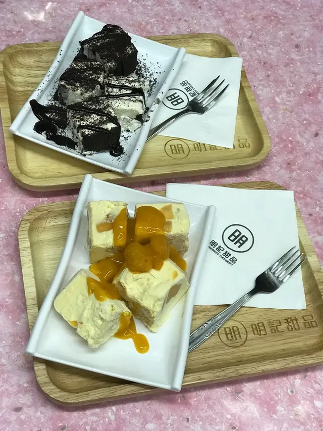 招牌芒果凍餅凍餅即係冰凍版木糠布甸、芒果凍餅幾特別,凍餅中夾住粒粒芒果肉,食落冰感重🍧,上面鋪咗新鮮芒果粒同芒果汁上枱。但記得記得記得要聽服務員說 上枱後待30秒-1分鐘先可開餐🍽,因為剛在凍櫃取出來係好硬好硬硬硬❄️☃️另一款凍餅呢個一定要試,係我每次都會叫黎食既 Oreo凍餅🍦🍪Oreo 經常也會被用作炮製甜品🥚🍰 但Oreo 餅就這樣吃已經很好吃,再加入不同甜品裡面,味道真的很棒,尤其是混合了忌廉,可惜的是 欠缺了芝士味🧀🧀,oreo和芝士兩種味道應該很夾,總覺得少了一種...不能形容空虛😂😂😂,明記凍餅係沒有芝士成份,如果可以多幾種口味就好了!(Ps.其實明記甜品係有原味木糠布甸和朱古力木糠布甸,以前在西灣河店食過 味道可以同澳門的比下去🤤,但不在餐牌上,愛木糠之人想食就要自已詢問服務員,因為不是日日供應的 )查看更多