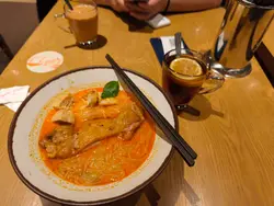 今天下午和老公來到屯門市廣場逛街,想不到星期六下午這間餐廳都有提供下午茶,價錢很便宜,於是我們便來到這裡吃飯。雞扒喇沙:喇沙的湯底很濃郁,微微香辣,我們選了檬粉,每一口都完美滲透了喇沙的精華,滋味十足,美中不足的是雞扒的肉質不夠嫩滑可口,如果口感柔軟一點會更好。泰式雞肉炒金邊粉:金邊粉的調味正常是酸酸甜甜,但這份略為甜膩了一些,不過金邊粉炒得很有鑊氣,雞肉亦算嫩滑,味道相當不錯。班蘭咖央西多士:班蘭咖央多士就經常見得多,班蘭咖央西多士就第一次見,當然要點一個來試一下,西多士即叫即炸,外皮很香脆可口,班蘭咖央味道甜甜的,味道特別得來又好吃。飛天通菜:下午茶可以用優惠價加配通菜,雖然味道比較辣,但是很好吃和開胃,我們都很喜歡。飲品方面,下午茶跟餐送熱飲,茶走和熱檸茶都挺好喝的。價錢方面,今次總共點了3份下午茶和1份通菜,餐廳設有加一服務費,兩人總共是$186。總結來說,這間餐廳的下午茶味道相當不錯,價錢又很划算,十分值得推介給大家。…查看更多