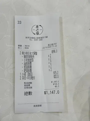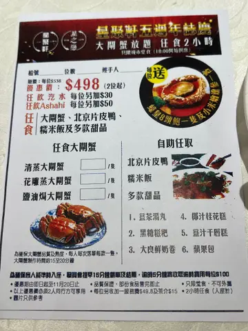 秋风起,又到吃大闸蟹的时候了,虽然现在只是刚刚开始,很多餐厅都已经推出了大闸蟹放题了。就像今天吃的这间在荃湾海之恋商场的星之恋也推出了放题,现在吃还有送鲍鱼和烩辽参呢。而且餐厅比较特别,有比较少有的窗边位,更有露天的地方,还可以看到夜景呢,不过今天就下雨坐不了,有点遗憾了,天气凉凉的在露天吃饭真不错呢。2小时任食放题(498元)这个放题主角一定是大闸蟹,尺寸约三两左右,有大有小的,都是公蟹。虽然个头不是很大,蟹膏什么不会太多,但这是放题呢,多吃几个就好了。而且上菜速度挺快,也可以多下单几只!蟹黄鲜甜,蟹膏软糯甘香,蟹肉滑嫩。而且更提供了三种口味,分别是清蒜,花雕煎和盐油焗,各有特色,原味最鲜,但花雕会有酒香,盐油焗就最惹味。送的鲍鱼口感爽滑,烩辽参的海鲜味很浓。其他还有片皮鸭,想不到是一整只即场片给你的,皮非常脆,肥而不腻的。糯米饭也有惊喜,材料很多,口感软糯,味道香浓,腊味很香。甜品也有6款可选,吃起来都挺新鲜的,都是现炸现蒸的,个人挺喜欢鲜奶卷和苹果包。…查看更多