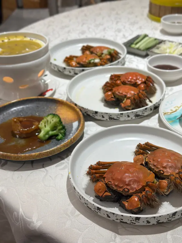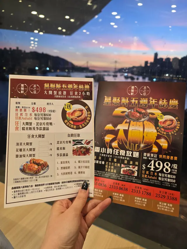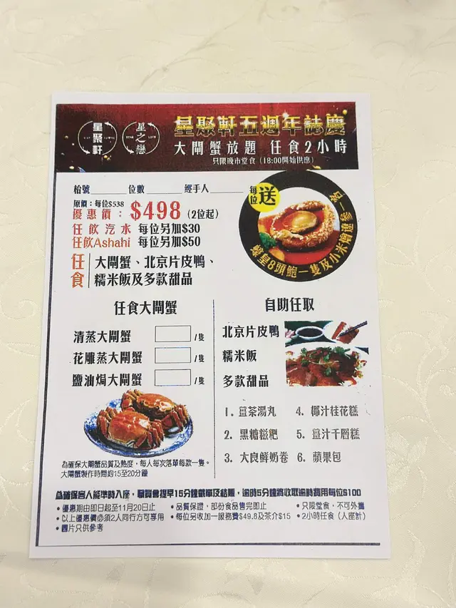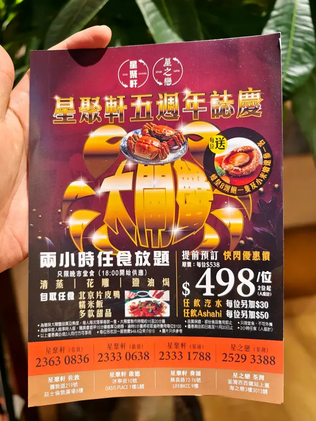 秋風起,又到吃大閘蟹的時候了,雖然現在只是剛剛開始,很多餐廳都已經推出了大閘蟹放題了。就像今天吃的這間在荃灣海之戀商場的星之戀也推出了放題,現在吃還有送鮑魚和燴遼參呢。而且餐廳比較特別,有比較少有的窗邊位,更有露天的地方,還可以看到夜景呢,不過今天就下雨坐不了,有點遺憾了,天氣涼涼的在露天吃飯真不錯呢。2小時任食放題(498元)這個放題主角一定是大閘蟹,尺寸約三兩左右,有大有小的,都是公蟹。雖然個頭不是很大,蟹膏什麼不會太多,但這是放題呢,多吃幾個就好了。而且上菜速度挺快,也可以多下單幾隻!蟹黃鮮甜,蟹膏軟糯甘香,蟹肉滑嫩。而且更提供了三種口味,分別是清蒜,花雕煎和鹽油焗,各有特色,原味最鮮,但花雕會有酒香,鹽油焗就最惹味。送的鮑魚口感爽滑,燴遼參的海鮮味很濃。其他還有片皮鴨,想不到是一整隻即場片給你的,皮非常脆,肥而不膩的。糯米飯也有驚喜,材料很多,口感軟糯,味道香濃,臘味很香。甜品也有6款可選,吃起來都挺新鮮的,都是現炸現蒸的,個人挺喜歡鮮奶卷和蘋果包。…查看更多
