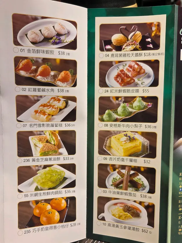入门口,装修有点旧式中国风,另设有包厢。主要客群是斯文的长者,环境宁静。一走进门店员立即上前招呼十分亲切。茶有蜡烛保持温度,很细心今次主要来试试精致的点心米网鲜肉锅贴米网很脆薄,但锅贴本身皮厚得有点干,肉的调味偏淡味道不过不失咸水角 外型10分可爱,炸得够酥脆,味道难略为偏淡,但口感丰富奶黄包外形100分,包的质感结实,强烈饱足感,但里面是少量白色的吉士酱,奶味不足,味道略嫌失望。黄金芝麻葱油饼说实话,看外貌真的普通,但咬下去外脆内软,芝麻及葱油香四散,吃下去有人不可貌相,卧虎藏龙,有惊喜!菇菌天鹅酥天鹅颈类似面粉团,基本上硬到不能咬开, 酥皮酥脆多层次, 但略嫌太油腻啊,菇菌也不够香。不推介红米鲜虾脆皮肠卖相还好,有樱花虾在外,使整个肠粉的香气提升,里面的虾春卷酥脆可口,但略嫌油腻。不过不失蒸点心类虾饺,皮不够薄,但胜在虾肉多,大粒叉烧肠粉 皮薄馅多。================整体评语整体的食物外形精致,调味偏淡,贴近食材原味,较适合长者。炸物酥皮类较油腻,可酌情点选。环境宁静清幽,店员服务好友善,亲切,慢慢点慢慢吃,也很自在。适合陪同长者/见客用餐。妈妈大人很喜欢,她表示会想再来