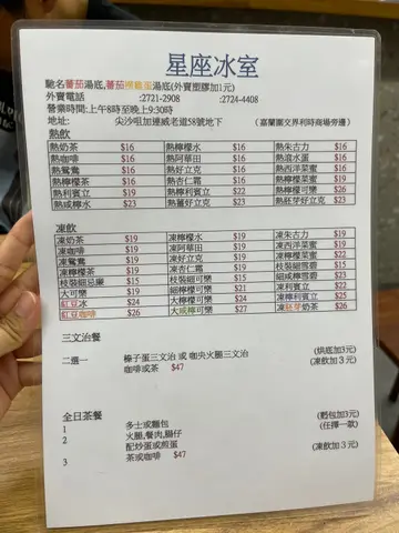 星座冰室 (尖沙咀) 网址: https://s.openrice.com/QrLS0RLy6W0 地址: 香港尖沙咀加連威老道58號地舖
