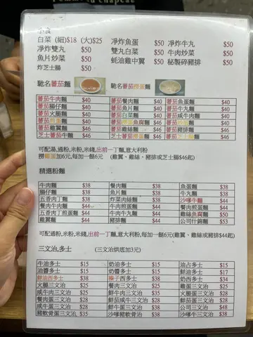 蕃茄牛肉面,蕃茄捞蛋鸡丝面,蕃茄芝士捞疍猪扒面,炸双丸,奶西多,红豆咖啡,胚芽奶茶。