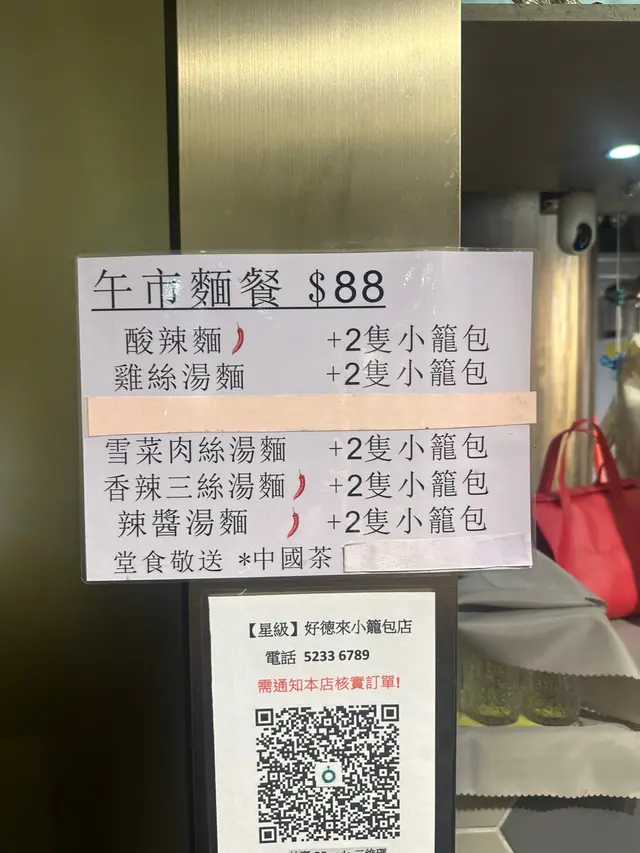 店舖電子化QR Code 落單,減省了員工落單時的急趕及壓力。門口已擺放了實體餐牌,睇啱價錢先入座一支公,當然選了午市套餐啦!一碗麵加兩隻小籠包$88, 套餐包括小籠包兩隻,主食麵有五款選擇,另外還有熱茶或滾水,如要支裝豆漿另加$10