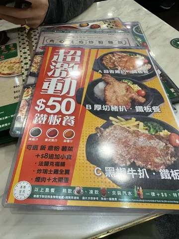 放工时间想响九龙湾求其医肚,响大渣哥、光荣同时代三者间拣左呢间系因为未试过。虽然系茶餐厅,但仍需自己QR code落单,唔好处系类似「野饮要少甜」、「走饭改菜底」的额外要求系做唔到,下下都要唔太应你的侍应去同厨房讲就比较麻烦。佢地无改菜底呢个option叫我地叫碟油菜,盛惠$22蚊,其实无所谓,但碟菜拎到黎的感觉令人无哂食欲…仲差过我屋企的厨余!另外叫左个铁板牛扒,我见到人地个个有张好似pepper lunch的纸圈围住个铁板,唯独我𠮶个无,不虞有诈,当你倒D汁落去个铁板度之后,我发现我成身、成张櫈、手袋、外套都沾上佢弹出黎的一点点油渍!正如我朋友讲,个鸡扒系OK的,但第一碟上的「剩菜」实在令人反感!同个大妈侍应讲,佢只系笑笑口然后行开左…服务简直一流!