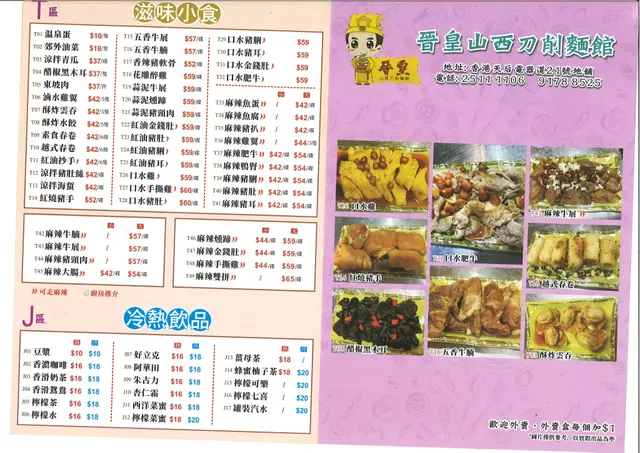 晉皇山西刀削麵館 (天后) 网址: https://s.openrice.com/QrLS0Nui900 地址: 香港天后電氣道21號地舖 电话: +852 25111106