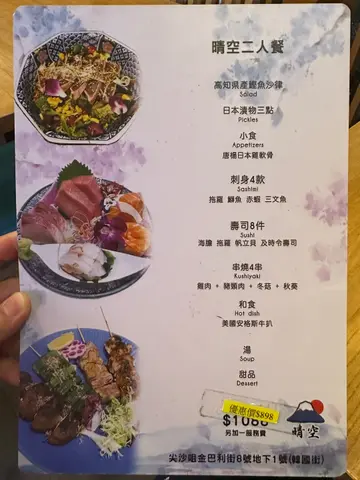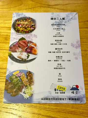 餐厅:晴空日本料理 (尖沙咀)地址:尖沙咀金巴利街8号地下1号舖今晚想同好友、闺蜜甚至另一半食日本菜?尖沙咀呢间晴空日本料理嘅「晴空二人套餐」相信喺个唔错嘅选择😎仲记得之前喺网路温度计DailyView嘅2025香港厨师发办热门餐厅Top10当中见到呢间餐厅,佢哋开咗就快五年,人气依然相当旺盛🔥,为嘅都喺想品尝呢度精致嘅日本美食行入餐厅见到唔少的骰布置,例如墙上可爱嘅晴空小猫咪🐈,悬挂喺天花嘅一团团白云灯饰☁️,仲有日式饮料贩卖机同埋怀旧游戏机等,每一个角落都值得你望多两眼欣赏吓🤩今次叫咗佢哋原价$1,098嘅二人套餐体验,依家做紧周年优惠只需要$898,就有九道菜,包括高知県产鲣鱼沙律🥗、日本渍物三点、唐扬日本鸡软骨、刺身四款、寿司八件🍣、串烧四川🍢、美国安格斯牛扒🥩、汤同甜品,款式算多,而且卖相吸引😍,加上所有食材即叫即整,食落新鲜有温度,唯一上菜有少少快,食得比较赶急同容易摊冻相信无人会反对呢个套餐由头到尾都喺视觉同味觉嘅享受,例如高知县鲣鱼沙律嘅鲣鱼香气浓郁,食落清新开胃🤤,鸡软骨够晒香脆可口,而刺身同寿司当然喺全晚焦点,拖罗、𫚕鱼、赤虾、三文鱼,每件都厚切新鲜,寿司部分更加惊喜,8 件手握包括海胆、拖罗、帆立贝等,唔时令都唔会比你食,加上咁啱朋友生日,提早同餐厅讲仲有Birthday牌摆盘,影相完全唔需要filter📸再嚟串烧拼盘,分别有鸡肉、猪颈肉、冬菇同秋葵,香料唔会太过多盖过食物嘅原味,特别一赞猪颈肉爽嫩充满肉香,好食到停唔到口🤤;和食有美国安格斯牛扒🥩,虽然份量唔算太多但肉嘅熟成程度啱啱好,配埋和风酱汁完美收尾;最后仲有汤同甜品——忌廉卷蛋,甜而不腻,如果个餐包埋杯饮品就perfect🤣,不过店员都好好不停帮我哋斟热茶🍵…查看更多