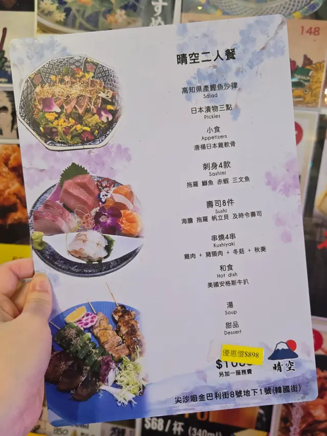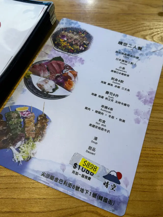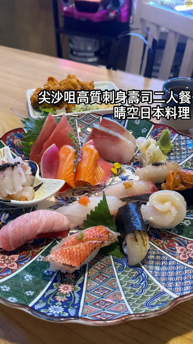 餐廳:晴空日本料理 (尖沙咀)地址:尖沙咀金巴利街8號地下1號舖今晚想同好友、閨蜜甚至另一半食日本菜?尖沙咀呢間晴空日本料理嘅「晴空二人套餐」相信喺個唔錯嘅選擇😎仲記得之前喺網路溫度計DailyView嘅2025香港廚師發辦熱門餐廳Top10當中見到呢間餐廳,佢哋開咗就快五年,人氣依然相當旺盛🔥,為嘅都喺想品嚐呢度精緻嘅日本美食行入餐廳見到唔少的骰佈置,例如牆上可愛嘅晴空小貓咪🐈,懸掛喺天花嘅一團團白雲燈飾☁️,仲有日式飲料販賣機同埋懷舊遊戲機等,每一個角落都值得你望多兩眼欣賞吓🤩今次叫咗佢哋原價$1,098嘅二人套餐體驗,依家做緊周年優惠只需要$898,就有九道菜,包括高知県產鰹魚沙律🥗、日本漬物三點、唐揚日本雞軟骨、刺身四款、壽司八件🍣、串燒四川🍢、美國安格斯牛扒🥩、湯同甜品,款式算多,而且賣相吸引😍,加上所有食材即叫即整,食落新鮮有溫度,唯一上菜有少少快,食得比較趕急同容易攤凍相信無人會反對呢個套餐由頭到尾都喺視覺同味覺嘅享受,例如高知縣鰹魚沙律嘅鰹魚香氣濃郁,食落清新開胃🤤,雞軟骨夠晒香脆可口,而刺身同壽司當然喺全晚焦點,拖羅、鰤魚、赤蝦、三文魚,每件都厚切新鮮,壽司部分更加驚喜,8 件手握包括海膽、拖羅、帆立貝等,唔時令都唔會比你食,加上咁啱朋友生日,提早同餐廳講仲有Birthday牌擺盤,影相完全唔需要filter📸再嚟串燒拼盤,分別有雞肉、豬頸肉、冬菇同秋葵,香料唔會太過多蓋過食物嘅原味,特別一讚豬頸肉爽嫩充滿肉香,好食到停唔到口🤤;和食有美國安格斯牛扒🥩,雖然份量唔算太多但肉嘅熟成程度啱啱好,配埋和風醬汁完美收尾;最後仲有湯同甜品——忌廉卷蛋,甜而不膩,如果個餐包埋杯飲品就perfect🤣,不過店員都好好不停幫我哋斟熱茶🍵…查看更多