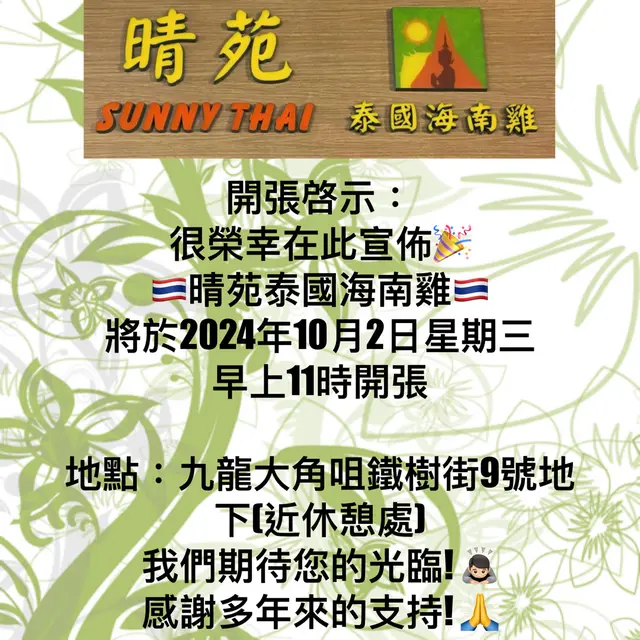 晴苑泰國菜 (大角咀) 网址: https://s.openrice.com/QrLS036W000 地址: 香港大角咀埃華街93號地舖 电话: +852 23966883