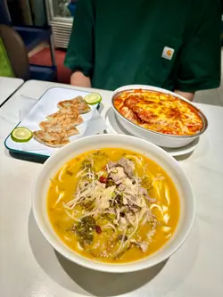 之前經過九龍城這間茶記(餐廳)好特別,有別於其他餐廳,它除了港式茶餐廳風味外,竟然有西式cafe的三文魚沙律,蛋沙律包.還有,上海美食例如:小籠包,生煎包,刀削麵,上海拉麵. 太多不同美食選擇,最適合我這種同一時間可以食到不同菜式(中西合璧)的肥妹仔😋😁下午茶餐時段~價錢比正價更抵食頭盤我們要了煙三文魚雜菜凱撒沙律($78),份量超大份,有4-5大片煙三文魚.真心抵食過cafe. 沙律菜也新鮮.碎蛋沙律雜菜牛角包(下午茶餐價$42), 碎蛋沙律酱份量也多.如果牛角包可以熱多少少應該會更好食.灌湯小籠包(4隻~$48)~ 因為餐廳部份廚房位是透明玻璃,所以看到廚師即叫即蒸.同一時間,看到廚師在準備刀削麵.餐廳熱賣是焗豬扒飯, 見到都多客人食. 我們也來了一客,果然好食,厚厚的一大塊豬扒,爽口彈牙, 蕃茄芝士酸酸甜甜配炒飯底,好好味😋瑞士雞髀葱油撈公仔麵~絕對係港式餐廳的特式推介之一, 美味的瑞士汁再B配蔥油的看,個人覺得比麻油撈麵更勝一籌.飲品~我選了什果冰,原來是利賓納底配七喜, 夏天飲完透心涼😋推介.價錢親民(街坊價)~5款主食,才二百八十蚊左右.每人平均60-70左右,食到飽. …查看更多