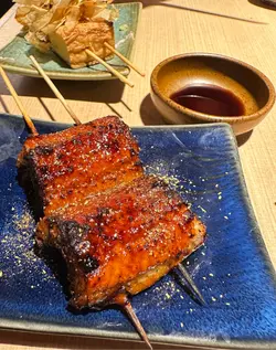 同事带我到太子汝州街的日式烧鸟专门店吃串烧。店舖毗邻地铁站,十分方便易找。一推门,炭火香扑鼻而来,还有开放式烤台前师傅专注翻动串烧的身影,令人恍如置身于江户时代的居酒屋。前菜静岗蕃茄和洋葱沙律清脆洋葱经冰镇处理后褪去辛辣,只余清甜本味,佐以酸甜油醋汁更显爽口解腻。蕃茄清甜好味。Omakase十串全程以盐烧技法演绎:◈ 梅子紫苏芝士鸡肉卷炭火逼出芝士浓香,紫苏清香与梅子酸韵交织,肉汁被完美锁在卷中,好味!◈ 串烧豆腐外层焦脆,内里却保持嫩滑。◈ 鳗鱼串上面的山椒粉很好味,酱油焦香包裹著肥美鱼肉,外脆内嫩。◈ 手打免治鸡肉棒扎实肉质中暗藏脆骨惊喜,蘸上浓郁溏心蛋液,完美配搭。◈ 鸡颈肉经店员提醒静待片刻,终得爽脆弹牙的完美熟度,简单盐烧已显肉质本真◈ 牛横膈膜野菜串横膈膜脆弹口感,与野菜清甜相映。◈ 烧鸡心与烧芦笋鸡心弹牙爽口毫无腥气,与清甜芦笋绝配◈ 鸡翼金黄脆皮下锁住肉汁,轻咬即爆发咸香,烧得很好味。◈ 豚肉糖心蛋将溏心蛋切为两半,蛋浆如熔岩流淌,豚肉焦香与蛋液非常配合,赞!𩽾𩾌鱼肝我们还叫了「限定海鲜」的𩽾𩾌鱼肝。绵密细腻的鱼肝带著淡金黄色泽,入口即化的肥美中透著柚子酸汁的清新,彷佛舌尖上的和风协奏曲。最后,我们吃了益力多雪糕与抹茶雪糕,酸甜奶香与醇苦茶韵为这场炭火盛宴画上句号。…查看更多