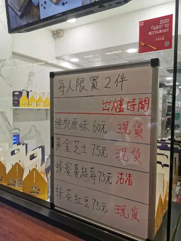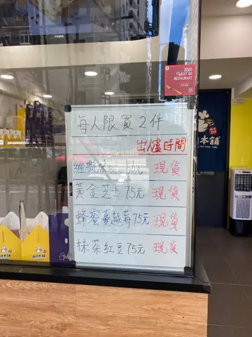 日本古旧让人怀念的拉面🍜台湾就有古旧让人怀念的蛋糕🍰永远都大排长龙的一家店今天居然被在下遇上一个人都没有太神奇了所以在这没经多思考就进店了蛋糕有4款口味黄金芝士 抺茶红豆 蜂蜜蔓越莓 原味这次在下没有选择困难症抺茶制品在下不喜欢蜂蜜的甜在下不喜欢在原味和芝士两者中很显然在下会点芝士 $75虽然不是刚出炉时间也错过了看他们把一大块蛋糕分尸不过这次能这般顺利地买到这蛋糕还满高兴的芝士粒随机分布蛋糕中央也有一层芝士不过对在下而言芝士稍为略小蛋糕软软的但很挺身把蛋糕切开这步骤和效果都比想像中好入口细致幼滑就算放冷了也不会变硬更不影响口味不过好像会微微变甜对了蛋糕有限定每人只能买2件生意太好怕被一个人买光吧这这是个不错的方法不过其实如果一个人吃的话一个蛋糕足矣再喝口水能把在下KO