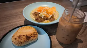 这次的用餐体验让我感到非常满意。首先,沙嗲牛肉的味道非常浓郁,肉质鲜嫩,配上香浓的沙嗲酱,让人一口接一口,无法抵挡。半焗流心蛋的蛋黄流心程度恰到好处,搭配著柔滑的蛋白,口感极佳,增添了整体的风味。转炒蛋的质感轻盈且滑顺,炒至金黄色,香气扑鼻,搭配通粉时,让人感受到家常菜的温暖。通粉的口感弹牙,与其他菜式相辅相成。不容忽视的是,加配的芝士蒜蓉软法包,外脆内软,蒜香四溢,让人一试成主顾。最后,冻奶茶的清凉感为整顿饭画上完美的句号,甜度适中,让人回味无穷。这顿饭不仅满足了味蕾,也让人感受到料理的用心,绝对值得推荐!…查看更多