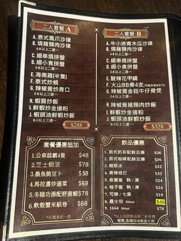 菠萝虎𧎚炒饭、冬荫功汤配野菌𧎚、劲爆生菜包、泰式柚子沙律、冬荫功明炉乌头、海南鸡、邑提雅椰子鸡船