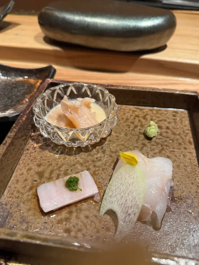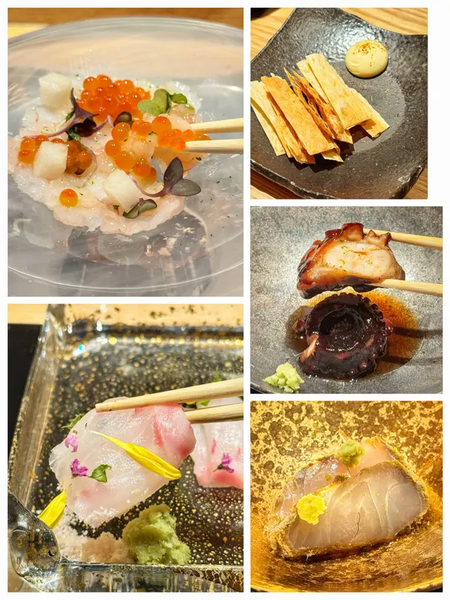 適逢係特別日子,同太太去食好嘢。特別揀咗呢間想試好耐嘅omakase。呢度嘅裝修記華麗又舒服,氣氛相當唔錯。前菜係筋子和日本兵庫縣金海老,筋子相當有彈性。另一個前菜係醬油煮八爪魚。八爪魚煮得淋,容易食唔難咬。再配上Wasabi我幾喜歡。之後上咗幾款刺身,全部都好新鮮。昆布漬明石真鯛,搭配得宜相當美味。天然石鯛魚配上鹽,Wasabi再加啲酸味汁,非常開胃。仲有當做嘅秋刀魚刺身,相當肥美入口即溶。赤貝刺身亦都非常爽甜。跟住嚟咗個炸物蟹肉春卷。蟹肉份量相當多,炸得非常鬆脆,一啲都唔油膩。上面仲灑上好多烏魚子,香口鬆脆好食。之後來個煮物目光魚配酒煮無花果。目光魚魚油好香皮脆肉嫩。無花果用酒煮過,好淋並且有酒香。跟住就到期待已久嘅壽司出場。肥美嘅中拖羅壽司,非常新鮮油分滿滿。日本關級池魚,魚味濃郁。海膽手卷,非常肥美新鮮,一啲腥味都冇,令人難忘嘅味道。鯖魚昆布卷,用昆布取代紫菜去卷壽司,相當新鮮嘅體驗。跟住來個松葉蟹斧飯配魚翅,相當豐富,蟹肉嫩滑再加上魚翅爽口,感覺好滿足。甜品係栗子蛋糕配日本哈密瓜。而家栗子當造,非常爽甜又唔溜,好清爽嘅栗子。哈密瓜清甜,好好咁幫我清喉嚨。呢個晚餐真係一個相當好嘅美食體驗,期待下一次再嚟呢度開餐。Read More