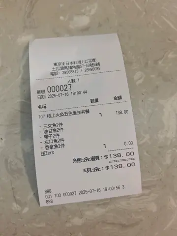 呢间东京街以前系其他分店都食过几次,一直都觉得佢地保持到品质同埋价钱真系唔贵。今晚系土瓜湾收工返屋企买左个外卖返屋食。不过呢间分店就唔系好大,主要都系外卖叫左个极上火灸五色鱼生丼,都已经包左沙律菜同埋饮品。呢个丼有几款刺身,包括三文鱼,油甘鱼,吞拿鱼,左口鱼同带子,每款都有2片刺身每片厚切,食落新鲜。火灸过特别有种香味,特别系左口鱼烧一烧过真系香好多而且入口就融即感觉。饭量都OK正常,食完够饱小提醒:餐厅都真系比较多外卖,所以都要等一段时间先有。