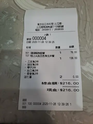 今天中午,我和朋友到土瓜湾马头角道的东京街日本料理去用餐。这里的环境好舒适。我们点了几样美味的日本菜式,首先是蒲烧鳗鱼饭餐,餐包括有一份清爽的菜沙律,鳗鱼皮脆肉滑,让我觉得好正好味道。接著,我们选了极上火灸五色鱼生丼餐,这碗丼饭真系色香味俱全!五种新鲜的鱼生在碗里,包括三文鱼、油甘鱼、带子、左口鱼和吞拿鱼,各有两件,铺满成碗饭,我一口鱼一口饭,实在是太鲜美了。每个鱼生的配搭都刚好,真是好享受!此外,个餐还送了一罐七喜,搭配著鱼生丼,感觉特别开胃。吃得好开心,真系爽!下次还想再来试下其他日本菜式。…查看更多