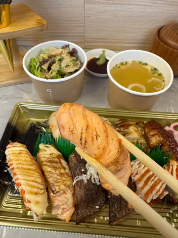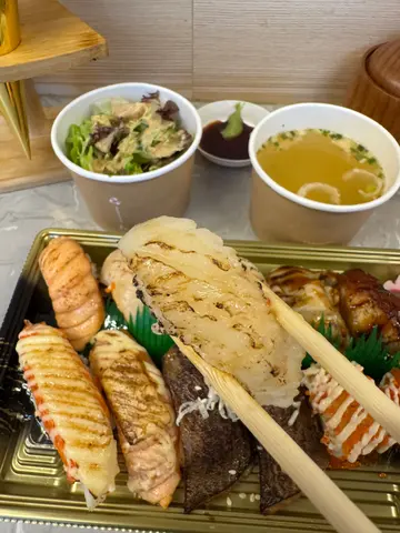 88有12件火炙寿司🍣+沙律+日式味噌汤最近都系少去外游好,特别东南亚地区,反正香港咁多好吃的,今日就食到一间超值日式餐厅餐厅风格极和式,望落干净又舒服,因为唔想食冻野今次选咗M2兰火灸寿司定食,有12件寿司,有齐各款三文鱼、左口、帆立贝、鳗鱼、蟹棒、油甘鱼、鱿鱼同加州卷,刺身经过炙烧后有少少焦香,脂肪融化,鲜甜加倍,加上照烧汁、蛋黄酱更美味,而且唔知系咪用日本产米的原因,饭好软腍烟韧,唔似争X寿司店嘅饭冻又硬,好食到立即又加左个软壳蟹手卷🙊跟餐附送面豉汤,暖苙苙,还有海苔和葱粒,好暖身。沙律菜新鲜爽脆沙律菜加大量胡麻酱,开胃大家可以堂食又可以外卖非常方便