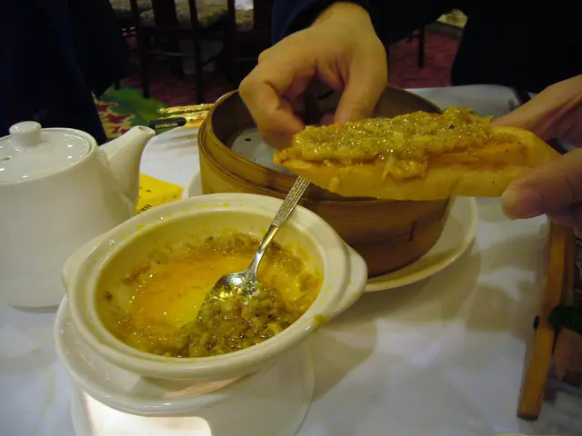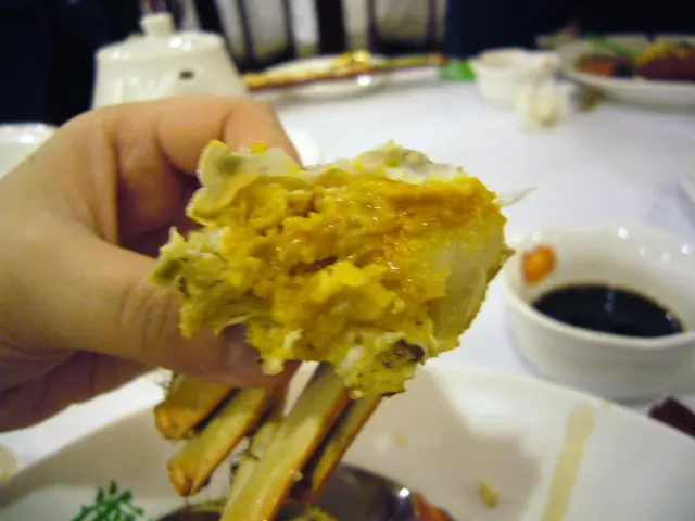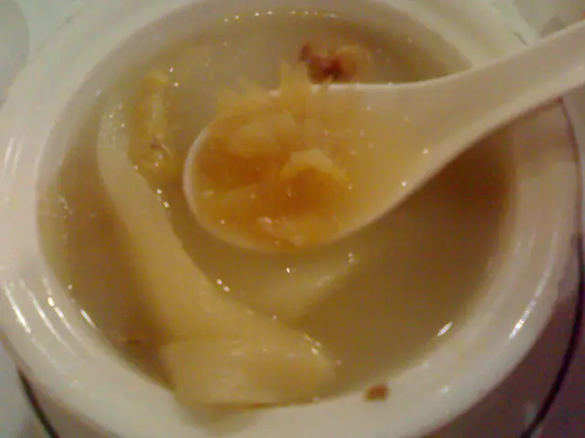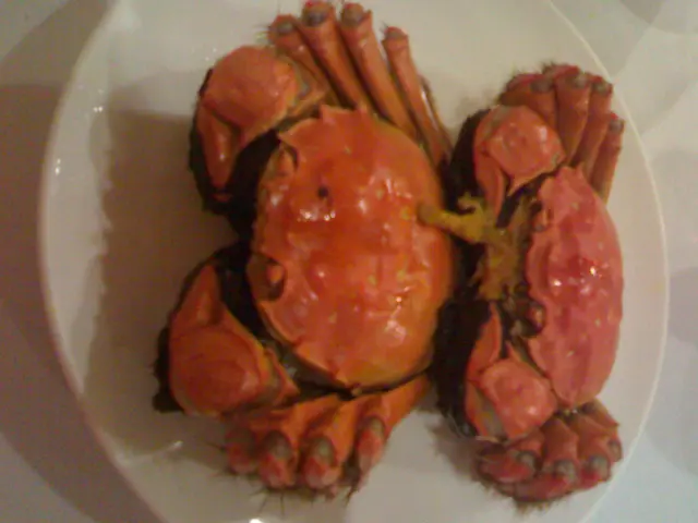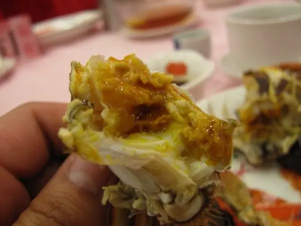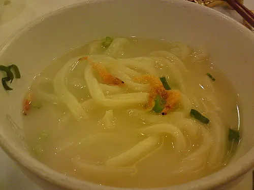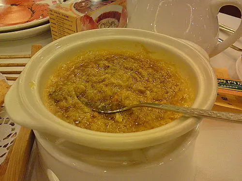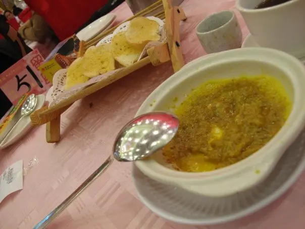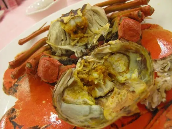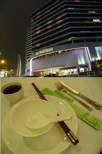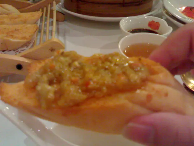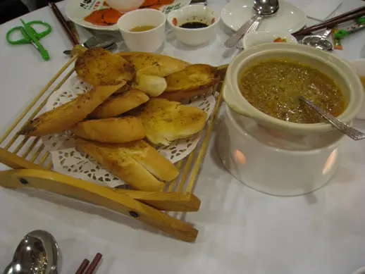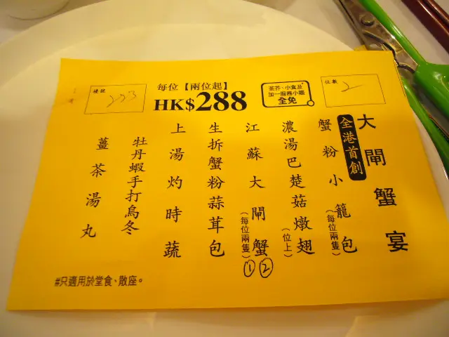 ,別做遺憾事,每人小半杯夠了,怕酒精超標中埋阿sir random check就弊了。紅酒味道一般,聊勝於無,不過酒杯有些污糟(桌布也是污糟)。2.花膠排翅: 花膠幾挺身爽口,比翅仔好食,湯也ok。3.粉皮白雲蝦&藍莓鵝肝紅黃茄: 粉皮很滑,白雲蝦就差過自己煮,配日本豉油芥辣有些勉強。藍莓鵝肝紅黃茄是沒有藍莓味的,鵝肝很凍沒味,紅黃茄卻很甜可口。4.柚皮鵝掌: 味道較淡啊…鵝掌很瘦啊…5.蒜茸蒸半邊龍蝦配意粉: 龍蝦size較細,意粉份量少,蒜茸汁ok開胃啦