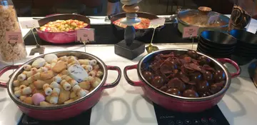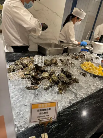 之前食过假日下午茶,百几数一位性价比高。今次就食环球海鲜、美国极黑牛铁板烧自助晚餐,时间比平时更早,系由17:00-19:00 2小时用餐:1. 冷盘食了美国生蚝,肉质鲜甜,清洗干净又冇𠮶阵过滤水味,龙虾如果冇见佢放上枱就要有礼貌地问职员拎2. 刺身只食了三文鱼,肉质滑嫩,油脂分布平均,其他3款唔特别唔想食3. 饮品有果茶、餐前酒、红白酒,咖啡奶茶等4. 冷盘有各种不同沙津,薯仔蛋沙津、南瓜沙津、凯撒沙津不妨一试,沙津菜好新鲜5. 热盘食过口水鸡,肉质滑嫩、红油炒手翻兜再翻兜、关东煮不过不失、猪脚姜够淋姜够入味,笼仔蒸虾爽口弹牙,卡邦尼白汁意粉够juisy,羊鞍好冧好食,芝士牛肉汉堡(铁板上) 一般6. 甜品有心意图案设计心太软,流心部份是特浓朱古力酱好好食唔甜、豆腐花豆味重口感唔错、tiramisù 唔好食口感怪、芒果慕士蛋糕、鲜果忌廉蛋糕、蓝莓批、啫喱糖、林明顿都唔错,款式好多,浅尝亦很满足7. 雪糕:Mövenpick 口味有云尼拿、士多啤梨、香蕉、椰子、柠檬青柠雪葩、蜂蜜杏仁,个人都系钟意云呢拿服务几好有礼,人手虽然唔多,但收碟&补给速度很快,个人建议食17:00-19:00 时段,冇咁多人又唔使同人争,系个唔错体验。…查看更多