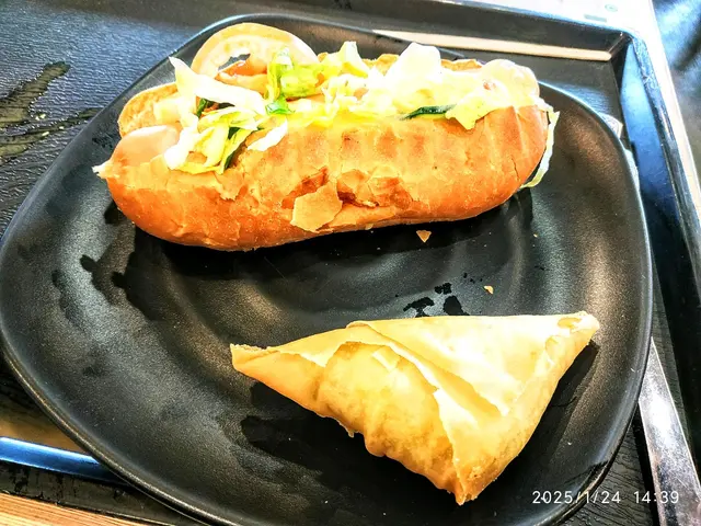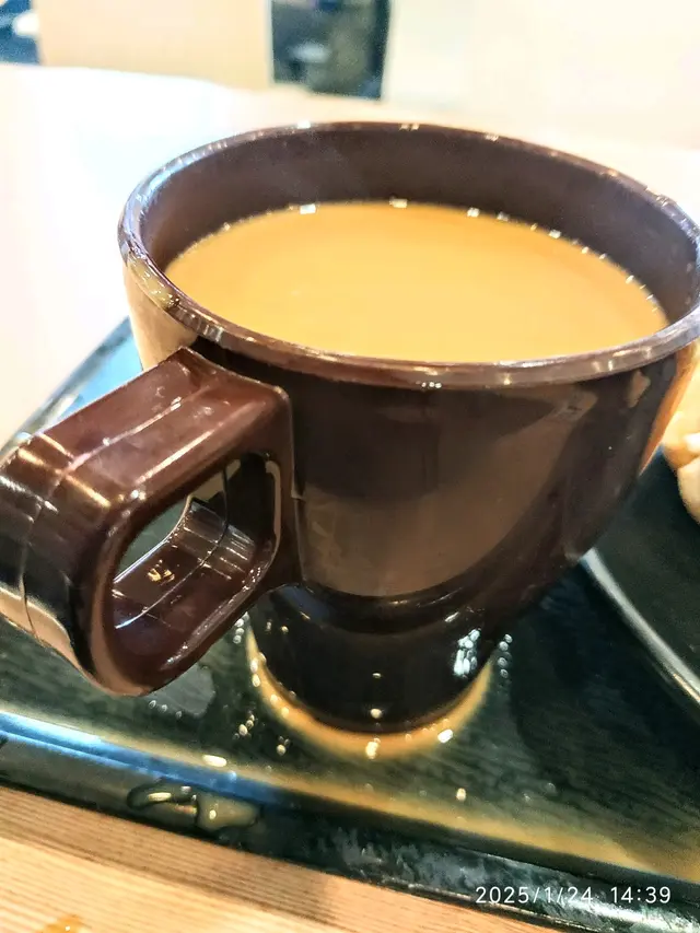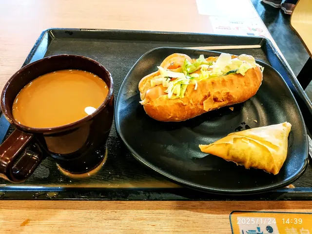 下午茶餐~熱狗+咖喱角配熱咖啡