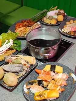 火锅区调味酱汁齐全选择多。有日式清汤,寿喜烧汤,日式猪骨汤可拣。肥牛肉类,肠仔丸类,蔬菜瓜类、面类也有好多。