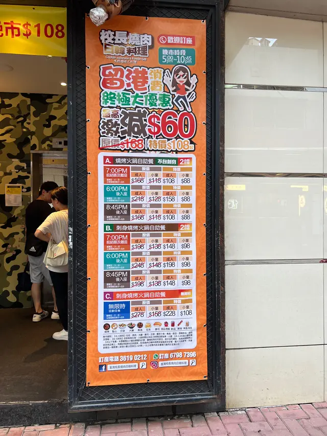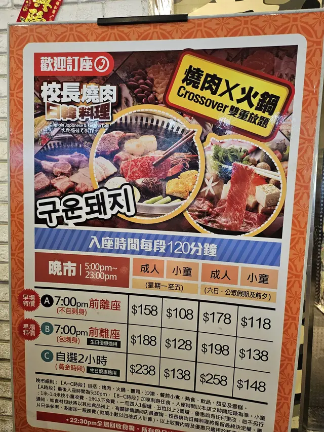 今次系第一次食校长烧肉成日经过开荃湾都会见到终于试吓价钱都算几抵食物种类都几多基本上系全自助嘅不过餐具就污糟咗少少火锅捞系肉眼可见嘅污迹夜晚八点左右雪糕已经冇乜都冇人补嘅但系其实冇乜人流应该好多时间补货但系喺食物种类同埋味道方面呢个价钱完全系抵食嘅但系值得一题系