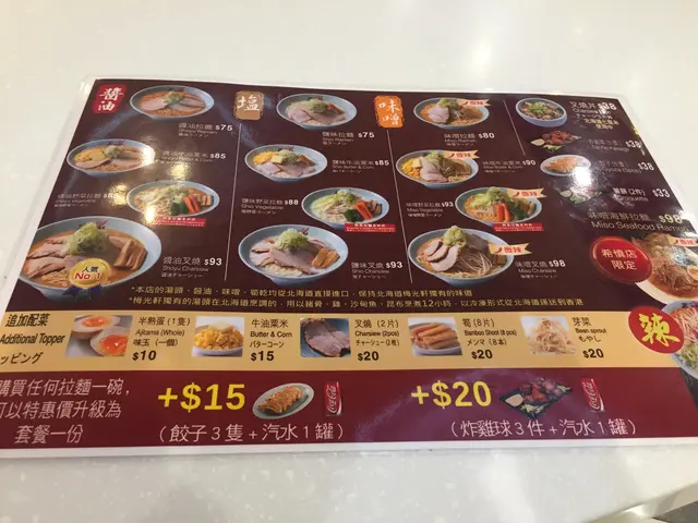 最近有雜誌推介梅光軒,我同男朋友都係愛拉麵之人當然唔可以錯過,要一睹風采。一個月前就同男朋友去左位於hysan 入面jason 有一間開放式的分店。香港有2間,另一間就係登龍街站立。相信會有一番龍爭虎鬥,話哂個到拉麵店林立今次黎到jason分店, 勝在唔洗等位。選擇都算多元化,但就無硬麵軟麵粗麵幼麵之分了。只有standard ge選擇,相信對選擇困難症ge人就有幫助。見到有個set包汽水小食只係80元,當然要試下la!只係比淨拉麵加多5元就多咁多野!但湯底就得鹽湯同醬油湯選擇!今次揀左醬油因爲我同男朋友都係重口之人。哈哈!另外仲叫左個叉燒飯。因為新年關係,送左個利是比我地。點知比我男朋友抽中左碗免費醬油拉麵,店員見到都驚呼得好小係拉麵卷咁都比你抽到!好啦 我都要比個叻佢👍🏻值得一提個叉燒飯係抵食之選!每啖飯都有叉燒,仲要肥瘦岩岩好!加埋d沙津醬食,真係一絕!見意大家要叫個黎試下,不過今次無影相!2次都有食個醬油拉麵 $75 (評分:8/10)麵質比較似公仔麵。但有Q彈的口感!湯頭食落有點焦香味,係豬骨湯底,但有別於豚王個類叉燒屬於偏瘦ge一種,所以肉質較鞋,但喜歡瘦叉ge人絕對係啖啖肉呀!呢碗係味噌湯拉麵$80 (評分:7/10)湯頭較醬油濃郁,帶點辣味。但不會太辣,唔食辣ge人都一定會食到!我就中意食呢個味多d!辣辣地食唔停!我就中意再加d醋,醋辣令我一啖接一啖無停過!另外ge係,店員都好熱情會主動問我地要唔要水。佢ge味粉都好多選擇,有醋,胡椒粉,黑椒等等等。查看更多