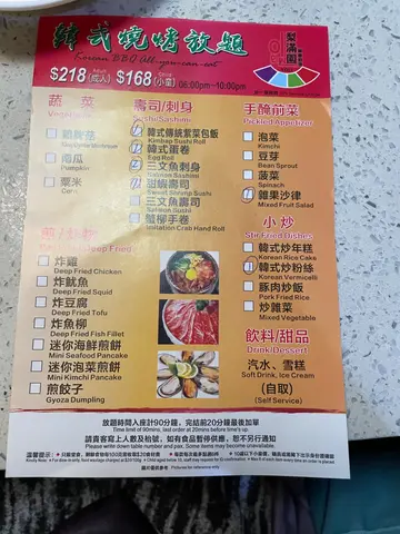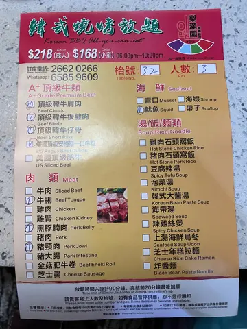 早一日订位,预订可优先坐卡位。个炉板几好烧,唔易黐底,限食90分钟内换咗两次算系少。收得成人晚市每位$26x,小童$16x左右。唔能够期望有华丽装潢,并且个抽气喉亦都大概只能抽走五成油烟,所以食完会预咗一身油烟徐。不过俾啲肉份量唔少亦非下栏嘢,仲要有啲三文鱼刺身片食吓,只系鱼生等咗45分钟先上菜。首轮送嚟嘅牛肩肉同牛板腱肉都肥瘦有致易啮开,惜后劲不计,之后几回送嚟开始愈嚟愈靭冇咁好牛味了。然而牛仔骨就keep住好食,少少肥肉黐住大大片瘦肉,烧起嚟唔鞋口,叫咗三回。值得一提系韩式蛋卷,卖相唔美艳,但食到有啲蛋汁香溜溜,卷埋啲紫菜几creamy又唔太咸,于是叫咗两回。炒粉丝又系样丑黐埋一堆但唔太油几够味。以小型韩烧放题嚟讲质素算系交到差。