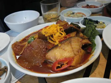 (2) 酱油银鳕鱼: 就系上次食0个个LOR, 都系咁好食, 不过D鱼少0左, 价钱仲加到180蚊TIM.(3) 韩式朱肠汤: 个MENU ONLY QUOTE0左个名, 无讲佢有咩材料, 所以我地叫0左, 典知, 佢一上枱, 一大阵臭味, 我谂, 应该系因为D朱肠处理得唔好, 洗得唔够干净。 我都照夹一件朱肠来食, 典知, 我觉得我自己好似食0左D纸咁, 好臭, 仲有一阵洗洁精味, 即刻放低无食, 找来经理查询, 经理就话D洗洁精味系因为柠檬叶, 算喇, 典知, 我再问佢D朱肠入面系酿0左D咩, 佢答我地系牛肉同糯米, 我地即刻 O 0左咀!