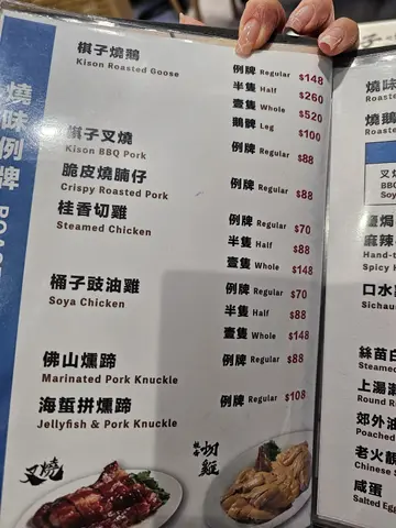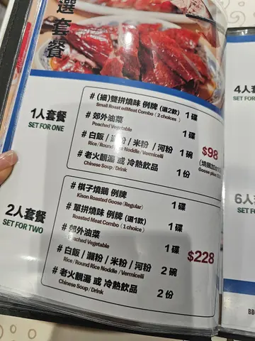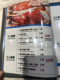 今晚放工正下著大雨, 在我们公司附近有 棋子烧鹅, 门面阔, 好亮丽. 立即 想食烧味餐. 门外有推荐食品, 外卖款式有多种. 玻璃柜挂著的烧味, 观感不俗. 烧鹅特别吸睛, 烧鹅头多至数不清.餐厅面积大, 灯光明亮, 座位整洁阔落. 餐牌好清晰, 项目多, 全日常餐, 下午茶, 好正 !!我们点了 2人晚饭套餐. 有棋子招牌烧鹅, 单拼叉烧/烧肉, 有菜, 汤/茶, $228, 好扺食.先送来餐茶: 热柠檬茶, 有柠香. 准备食烧味去腻. 例汤热腾腾, 鸡脚煲瘦肉汤, 无味精, 好饮. 蚝油菜心, 嫩绿少油, 爽口, 好健康. 招牌棋子烧鹅, 叉烧 各一碟, 送来了. 份量好满意.烧鹅颜色立立令, 鹅肉厚厚, 少脂肪, 渗出阵阵炭烧香, 味香四溢, 鹅皮脆脆, 脆皮底下的鹅肉好松软.配有秘制烧鹅酸梅酱, 点些酱汁很滋味, 送饭一流. 叉烧 , (可拣全瘦, 半肥瘦及肥义) 我们选择了半肥瘦. 烧得香, 卖相也不错. 用了五花腩肉, 吾肥有蜜汁. 不油腻, 真滋味.汤濑粉, 把青葱分隔开, 濑粉好滑, 汤头甜.配烧鹅, 一流好食. 白饭粒粒完整, 雪白分明, 用上靓米.招牌棋子烧鹅 好好味 , 食得非常满意. 叉烧也不俗好回味. …查看更多