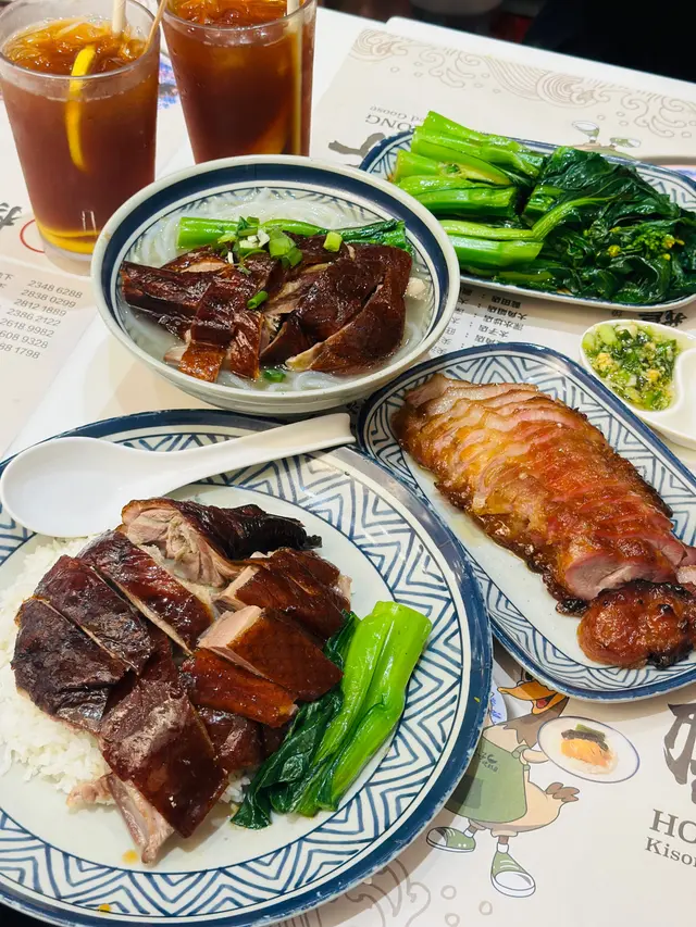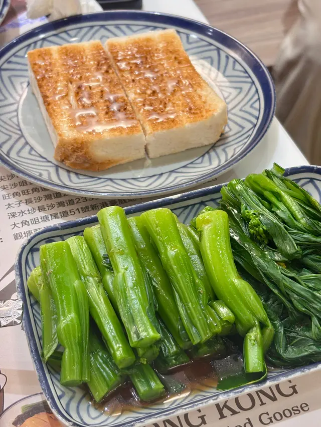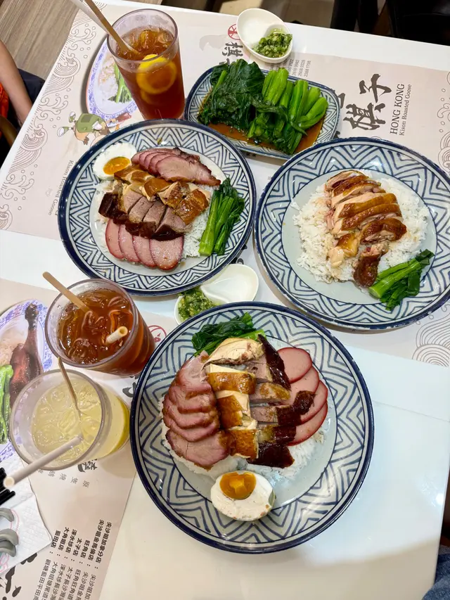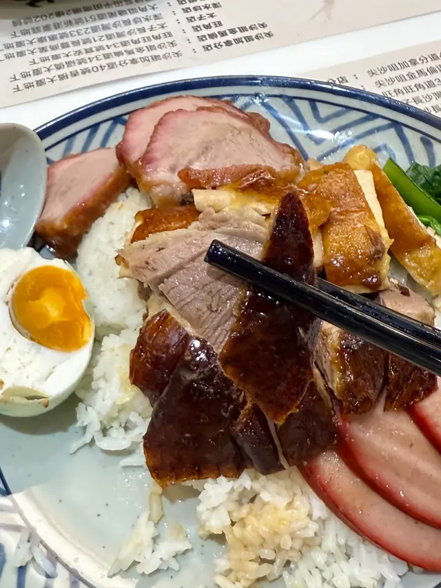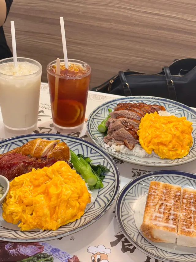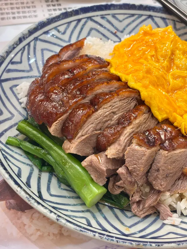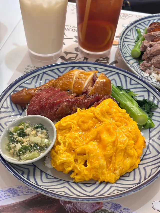 👉🏻棋子烧鹅片饭+滑蛋强推!烧鹅绝对是镇店之宝!刚端上来就被油亮的外皮吸引,咬下去“咔嚓”一声超清脆,脆皮薄到透光,里面的鹅肉嫩到爆汁,咸香中带着一丝果木熏烤的香气,完全不腻!滑蛋嫩得像云朵,拌着米饭吃,一口烧鹅一口蛋,幸福感直接拉满!👉🏻双拼叉烧和鼓油鸡饭+滑蛋选择困难症直接冲双拼!叉烧肥瘦均匀,外皮微焦带点焦香,咬开是甜丝丝的肉汁,肉质软嫩不柴;鼓油鸡皮滑肉嫩,鸡皮带着微微的胶质,鸡肉吸足了鼓油的鲜香,咸甜适中超下饭,搭配滑蛋又是另一种满足!💡性价比真的绝:•主食+7HKD就能换热饮或冻饮,冻柠茶、热奶茶随便选,这价格在香港真的太良心!•清炒油菜才20HKD,绿油油的超新鲜,解腻又爽口,配烧味刚好。•最后加了份炼乳多士,外皮烤得酥脆,内里松软,抹上厚厚的炼乳,甜而不腻,收尾超完美~店里环境很有老香港的味道,厨房挂着的烧鹅整整齐齐,油光锃亮的样子看着就超有食欲!来香港玩想吃地道烧味的,这家真的可以冲~查看更多
