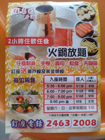 几星期前同朋友食过,果次一行八人,坐晒一间房,环境好,服务态度又好,食物都唔错但今次翻兜,就失望而回。上菜慢,催左几次先黎...食物质素:列出几款印象较深的----三文鱼:厚切,但size细,切到正方形咁鸡软骨:炸得㶶左,好咸烧牛柳粒:咸,好un, 食左一串就无食,上次一个人都扫左五六串寿司:好细旧,不过放题既话细细旧都ok天妇罗虾:油到渗出黎天妇罗蕃薯:蕃薯得少少少少至于火锅料就算少,丸只得三四款总结:唔抵食。食物质素中等,胜在环境大,有户外可食烟,如果要食靓野或者想食好多唔同款,就唔推介呢间,下次都唔会再黎了…查看更多