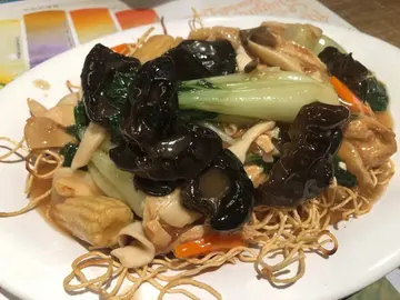 之前在椰林阁食过下午茶都不错炒的食物,今次就来见到有不少晚餐但只是小菜,所以最后就在主餐牌看到有个罗汉斋炒面五十六元,就叫了一份来吃,因饮品要另计就叫了水饮,食物好快来到了,没想到份量都几多几靓,面都有不少的白菜同素食,嗅得都几香,但可能酱汁过多闗系,反而觉得只有很少的炒面干炸脆的口感,味道不太浓,清清地,最后再加上辣椒酱就好味得多,而这里的辣椒酱都几辣惹味,炒面口感都可以而且份量都不少,最后一人都吃不完,没想到这里的炒食物都不错,可以下次过来再试晚餐小菜。在晚餐中选了土鱿蒸肉饼饮茶走七十二元仲有个白饭,叫了等了十多分钟就来到都几大碟。而且都几香,白饭一碗都应该够食。肉饼入面都几多鱿鱼,味道都几浓而又不太咸,有了少少葱所以增加不少香味,但一食肉的口感太淋,应该是比较多肥膏或猪肉不太靓,但都叫可接受的,豉油不太咸,送饭不错,肉饼即整的感觉都几新鲜,白饭都煮得刚好。饮品热奶茶够热但茶味不够,感觉有点淡而且不够滑。…查看更多