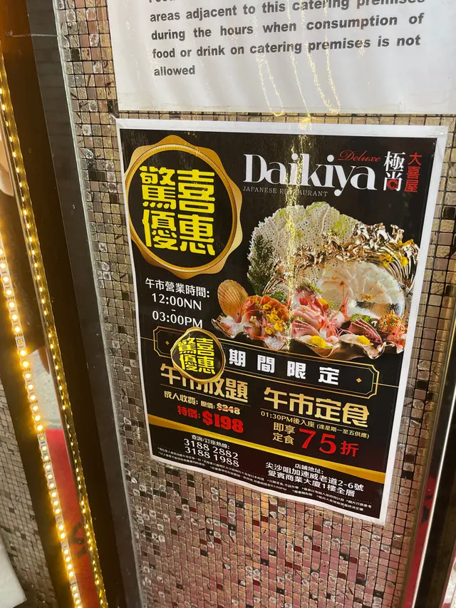 同朋友行完利時,她說好像很久沒吃放題,就近近地來到極尚大喜屋~沒有預訂座位,walk in不用等位。2小時自選時段,每位$288加一。掃瞄QR code點餐後,食物都好快送上。刺身質素不錯,油甘魚﹑帶子﹑池魚﹑劍魚腩﹑象拔蚌﹑赤貝等,點完一round後又再點~~~辣酒煮花螺,辣度足幾惹味,而且不會太油膩。極尚咖喱蟹,咖喱味道帶微甜,味道香濃。味道不錯,只是拆蟹有點麻煩,蟹肉不會太霉。鹽燒牛舌及燒雞軟骨,不會燒得太乾身。牛舌還帶點黑椒香。蒜片炒牛柳粒,牛柳尚帶有肉汁,整體味道幾香,不錯啊!風味淋燒魚干,帶微甜,又不會太乾硬,朋友幾喜歡吃這款魚干,所以都有encore!海膽軍艦,海膽有淡淡的甜味,唯紫菜還是有點稔,不夠脆。壽司還有海鹽左口魚邊及松葉蟹膏燒赤蝦,前者是穩打穩紮之選,左口魚充滿魚油份香~~反而另一款的松葉蟹膏不太突出。什菇露筍炒珊瑚蚌,充足的蒜與牛油香,珊瑚蚌不會炒得太老,仍夠爽脆!雪花牛肉鍋,湯底夠濃又香甜,牛肉大片,質感軟嫩~~不錯啊!!天婦羅的脆漿略略厚了一點點,尚可接受。炸物炸得香口惹味,幾款都令人吃得夠滋味,尤其芝麻雞翼充滿肉汁!!唯西京燒比目魚稍為遜色,質感較為乾硬呢~~極品瑤柱花甲粥,整鍋粥都沒有那陣鮮甜味,兩者味道獨立。就各款料理而言,極尚大喜屋的食物質素都算不錯呢~~~…查看更多