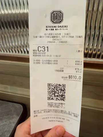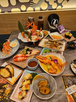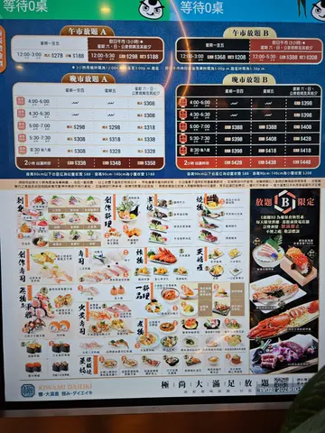 。星期六、日、假期午市做到5:30pm,我哋食完离开时一样见有人入座。而且,可以食足3小时,够晒时间慢慢叹。餐环境讲咗咁多,顺便介绍埋自助食物区,就晌入门口左边,地方都好大,通道同样阔落,唔怕人撞人。扫视一番,绝对令人花多眼乱,非常多元化,睇相你都见,照顾到唔同年纪层嘅人,包括有30多款冷盘小食、沙律,以及自助餐常见嘅冻海鲜,仲有烧味、炸物、热汤、点心、生果、甜品、雪糕雪条、软雪糕搭多种配料、自助茶啡、果汁、自家制健康饮品,同埋一大柜多到数唔晒嘅饮品。净喺呢个自助区都可以食饱人啦!除咗出面自助食物区之外,呢一款「放题A」可以点嘅食物分类有刺身、创作刺身、串烧、烧物、卷物、军舰、寿司、创作寿司、火炙寿司、炸物、天妇罗、一品料理、煮物、蒸焗铁板烧系列……等等,相信计计埋埋晒有超过百款食物。价钱就分日子、分时段,自行研究研究。如果贪心少少想食多啲贵价菜式,可以选「放题B」,等同「放题A」加多$80,就有近10款特别嘅菜式任点任食