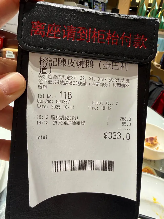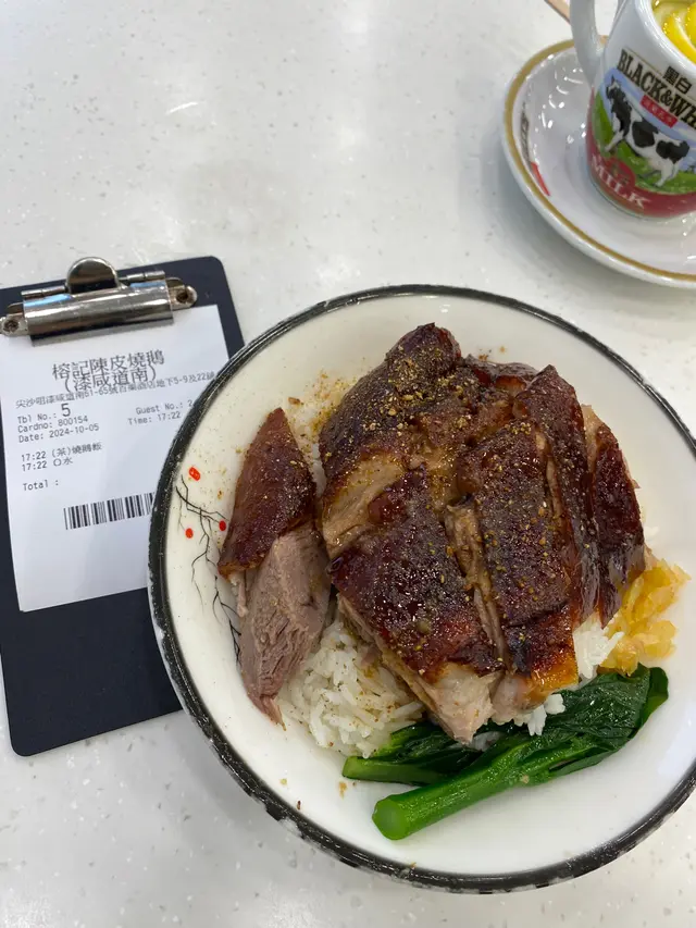 榕記陳皮燒鵝真係唔錯!我同朋友三個人去尖沙咀食,叫咗叉燒油雞飯同埋乳豬例牌。首先,叉燒油雞飯啖啖都係肉,叉燒肥瘦適中,醬汁好入味,咬落去口感滑溜,真係食得停唔到口。油雞更係鮮嫩多汁,飯粒吸咗汁,好好味!再講講乳豬,皮脆肉嫩,咬落去嘩,皮香脆得嚟又不會太油膩,啖啖都係肉味,真係令人一試成主顧!整體來講,佢哋嘅燒味做得相當出色,無論係味道定係食材新鮮度都好有水準。環境方面,雖然唔算好大,但坐得舒服,服務員都幾友善。總之,榕記陳皮燒鵝係個唔錯嘅選擇,下次再去肯定會再試其他嘢!…查看更多