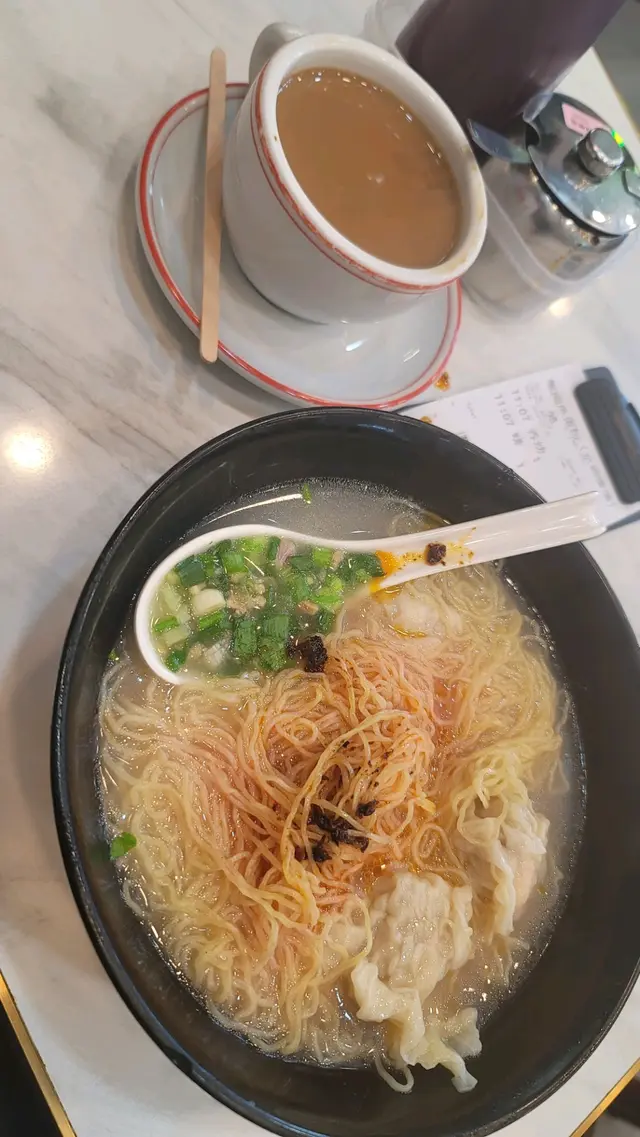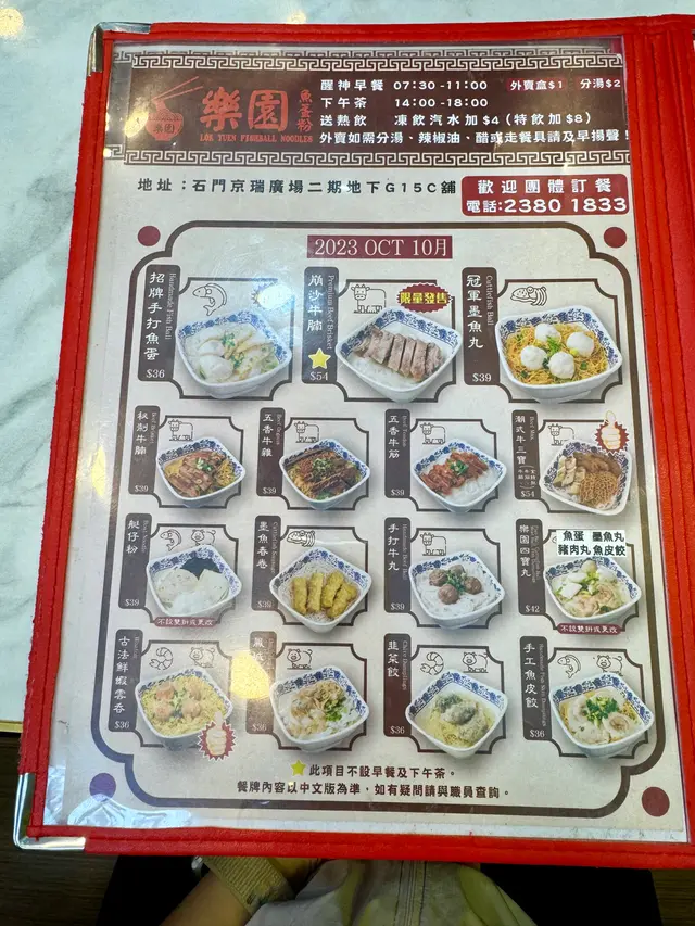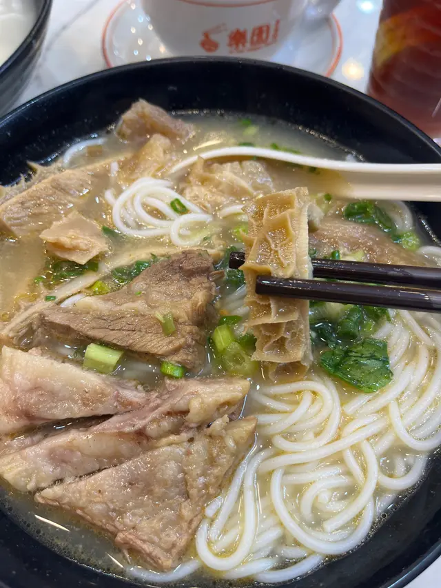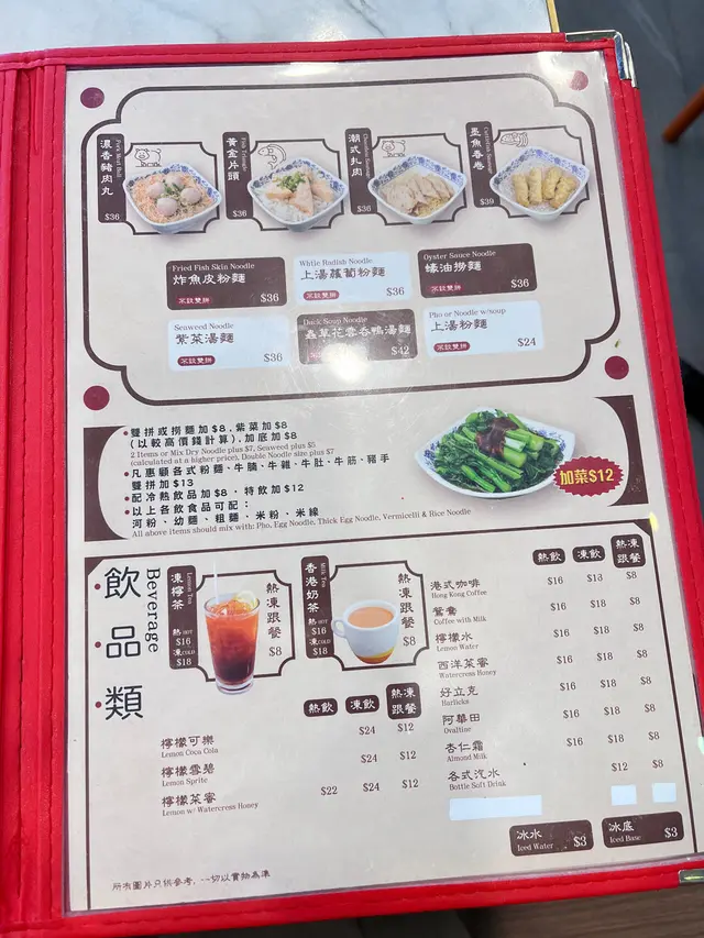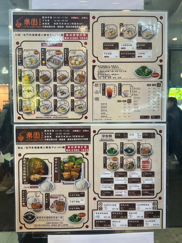 大家好今日去了石門既樂園魚蛋粉食麵我是在早餐時段去食發覺原來早餐食粉係有熱飲送果日食左兩碗粉面第一碗係古法鮮蝦雲吞面湯底係傳統既大地魚湯面是蛋麵都幾彈牙雲吞有四隻都比較大隻有蝦同埋豬肉而另一碗就係我比較鐘意既潮式牛三寶河因為一碗就有齊 牛肚牛筋同牛腩這個湯底都係比較有牛味而每一樣材料都起碼有四件見到牛肚牛筋都炆得好腍牛腩D部位俾得幾靚無牛肚牛筋甘腍可以咬到牛肉既口感飲品方面要左熱檸茶同熱奶茶都有茶餐廳既水準熱檸茶有四片檸檬比較有茶味而熱奶茶都幾香濃另外仲加$12要左碟蠔油菜心菜心幾軟熟且份量都多所以呢間整體既食物質數都唔錯早餐或下午茶時段有熱飲送就更加抵查看更多
