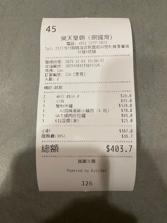 樂天皇朝 (利舞臺廣場) (铜锣湾) 网址: https://s.openrice.com/QrLS065SD00 地址: 香港銅鑼灣波斯富街99號利舞臺廣場16樓A號舖 电话: +852 21777873