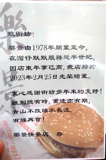老字号「 乐景快餐店 」🥲已结业由1978年开业陪伴唔少港岛人成长就连我呢只西贡牛屎妹🐂都光顾过无数次数数手指🤌🏻 应该由2012年开始帮衬🥡2023年要结业真喺非常婉惜🥲🥲🥲舖面其貌不扬 🌀 一眼睇晒左边 墙身贴上大大块餐牌📜右边 贴满饮食男女/其他报纸杂志介绍专栏📰✌🏻张充满岁月痕迹折枱走不羁风格开放式厨房 🤣厨房煮咩 🐻身上就咩味价钱相当平民实惠虽然忙不开交😵💫💨💨💨但仍充满人情味 🫶🏻 气氛毫无压迫感包括中场休息担住口烟🚬唏嘘嘅店员👨🏻语气都相当温柔「 啊妹随便坐 想食咩? 」( 各位 ! 我差点恋爱了😂😂 )🤎 招牌菜 💛除咗生炸鸡髀鸡翼 同 大量平价碟头饭之外仲有我至爱🤎️港式地道🍔芝士汉堡蛋包🍔 $23-全人手制 🤜🏿手打牛肉汉堡扒🤛🏻 真材实料!肉质非常松软 🤎 内里加入碎牛、洋葱🧅牛味极为香浓内里仍保留肉汁💦💦咬落有些少根😬每一口都喺滋味✨ ✨ ✨汉堡包会预先摆喺铁板上反覆轻轻煎过包边 微微焦脆;包心 金黄色再煎汉堡扒🥩 & 鸡蛋🍳 .. 最后连茄汁🥫+芝士🧀一齐组合师傅一连串动作爽快利落 过程令人目不暇给最后 外卖放入白底红字纸袋🥡极具怀旧港式风味🇭🇰👋🏻👋🏻…查看更多