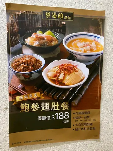 想太子附近揾个地方食快饭,但系好多地方都要等位,就嚟咗这一间落汤鸡面馆, 食个快饭再返屋企两个人快快脆脆拣两个餐就食我拣咗至尊鲍鱼鸡大碗饭朋友拣咗砂锅花胶鸡汤翅配白饭砂锅云吞鸡汤翅配白饭真系有一梳梳鱼翅仲有花胶以94蚊嚟讲又有鱼翅又有花胶算系不错至尊鲍鱼鸡大碗饭有一只鲍鱼,鲍鱼畀想像中大只鸡肉都好滑最好食系底𠮶啲饭,饭系调咗味,同埋 有一啲冬菇炒埋一齐, 同埋大碗饭饭真系好大碗,大碗到食唔晒