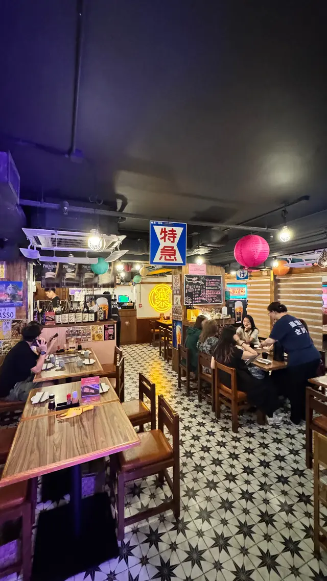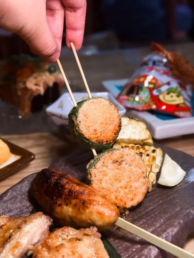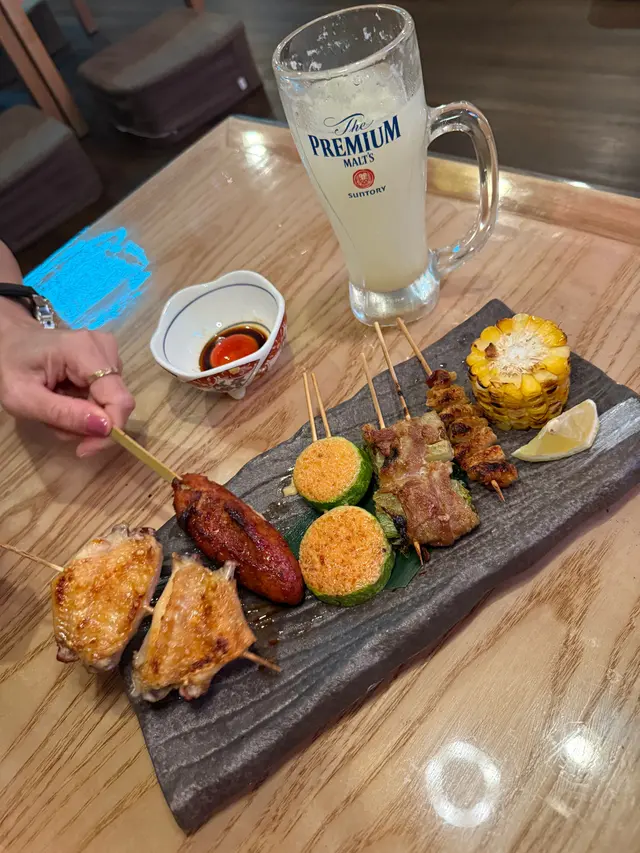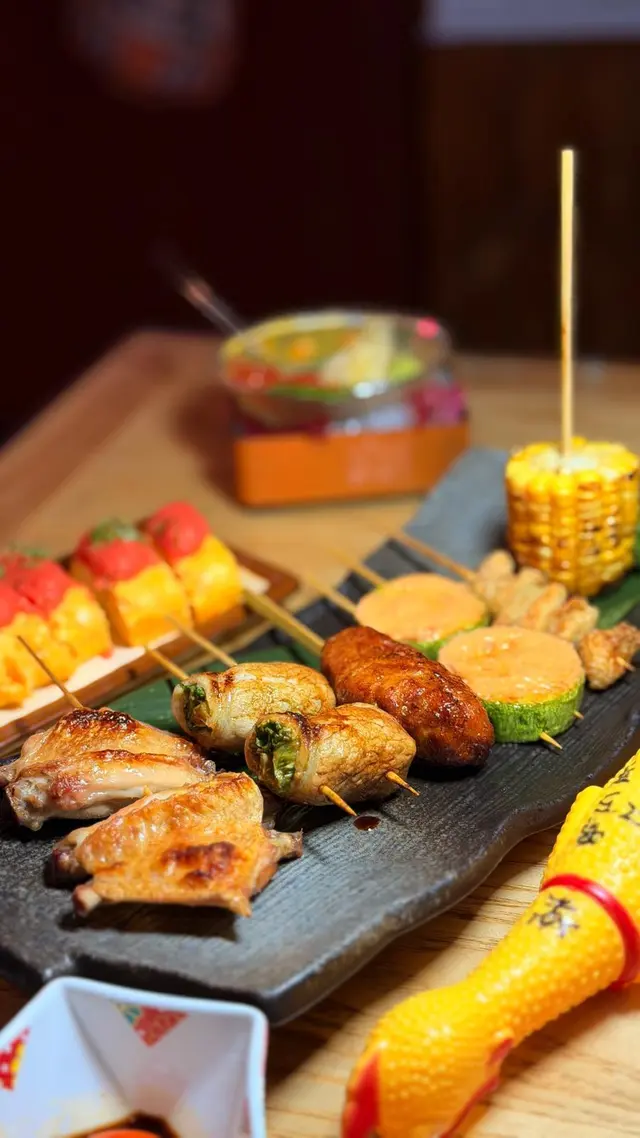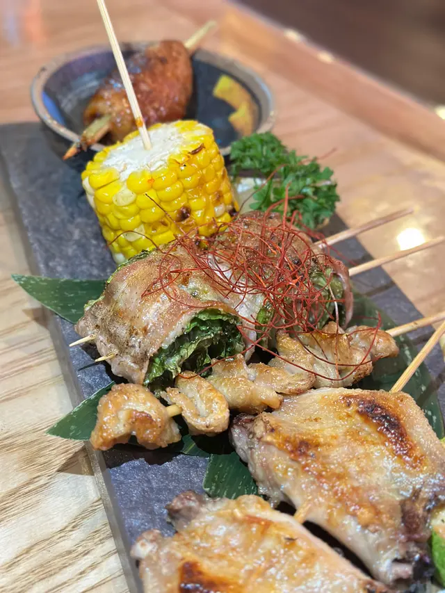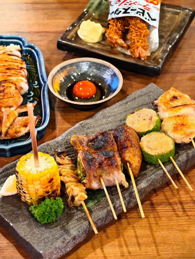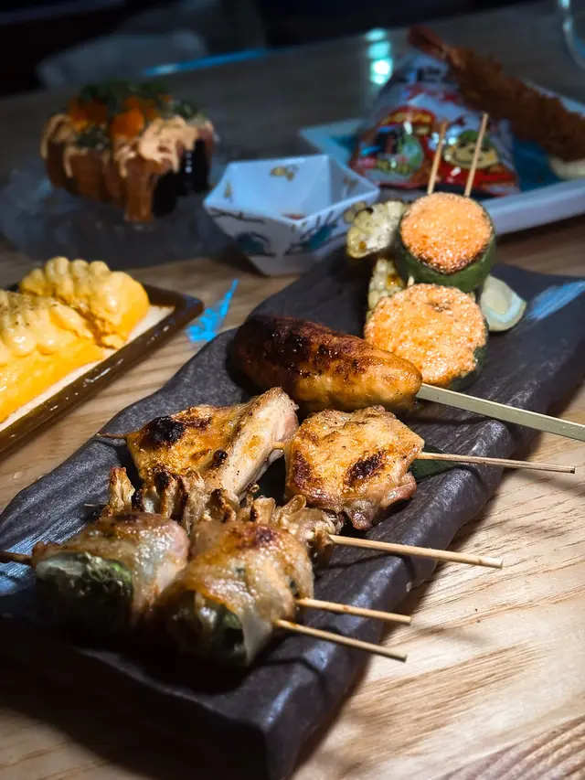 餐廳有濃濃的日本氣息,挺適合拍照的,而且更有榻榻米的餐桌可選,這樣吃起上來更有風味了。而最近剛好出了一個優惠串燒套餐,性價比不錯。串燒combo (188元)一共包括了6款不同的串燒,還有一杯雞尾酒,性價比挺高的,不過要預訂先可以!分別有燒明太子西葫蘆,香菜豚肉卷,鹽燒雞皮,燒雞羽,牛油燒粟米和自家制雞軟骨棒,有菜有肉的,而且都燒得剛好,皮脆肉嫩,帶點焦香。很多人喜歡的雞軟骨棒也有,配上雞蛋一流。自家製鹽檸檬燒酎喝起來清爽又有油香。三文魚層層疊(138元)底下的是青瓜卷,然後上面放滿了三文魚再加上芝士和沙律醬,再經過火炙一下,帶出焦香,吃的時候再加上魚子和蔥花增加香味。三文魚比想像中的更滑嫩,加了沙律醬,整體味道更濃厚。烏賊磯燒(95元)烏賊燒完以後,味道干香,烏賊味特別香濃,口感彈牙。海之幸TACO(78元)下面是吞拿魚蓉,然後放上海膽和三文魚籽,整體鮮味突出,接近入口即化的口味,特別鮮甜。國產和牛他他TACO(78元)上面滿滿的生牛肉他他,用上比較肥美的國產和牛,再加了點蔥花來提味,令整體變得外脆內軟,又有和牛油脂香味。芝士醬厚燒玉子(98元)玉子燒真的很大很厚的,但吃起來不老,蛋味香濃,上面加了芝士醬,還經過火炙來迫出香味,芝士味特濃。吉列童星蝦(2隻)(68元)比較少見,亦很有童年回益的,而且價錢不貴,蝦也大大隻,口感外脆內爽滑。巨峰梳打(52元)味道香甜,口感清爽。…查看更多